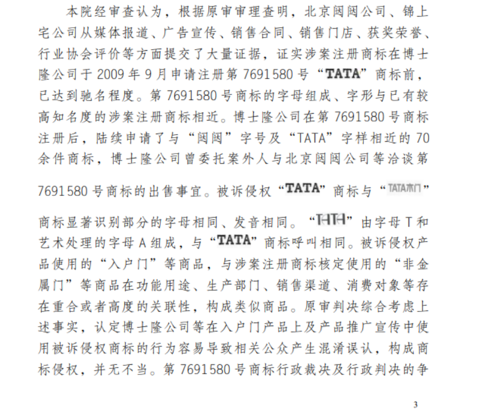 法院裁定认为,博士隆于2009年9月在第6类“金属门”等商品上申请“图片”商标时,“图片”商标及“图片”商标在中国境内已为相关公众广为知晓,属于驰名商标;博士隆对第7691580号“图片”商标申请构成恶意注册;博士隆等三公司在入户门产品上及产品推广宣传中使用“TATA”商标的行为容易导致相关公众产生混淆误认,构成商标侵权。