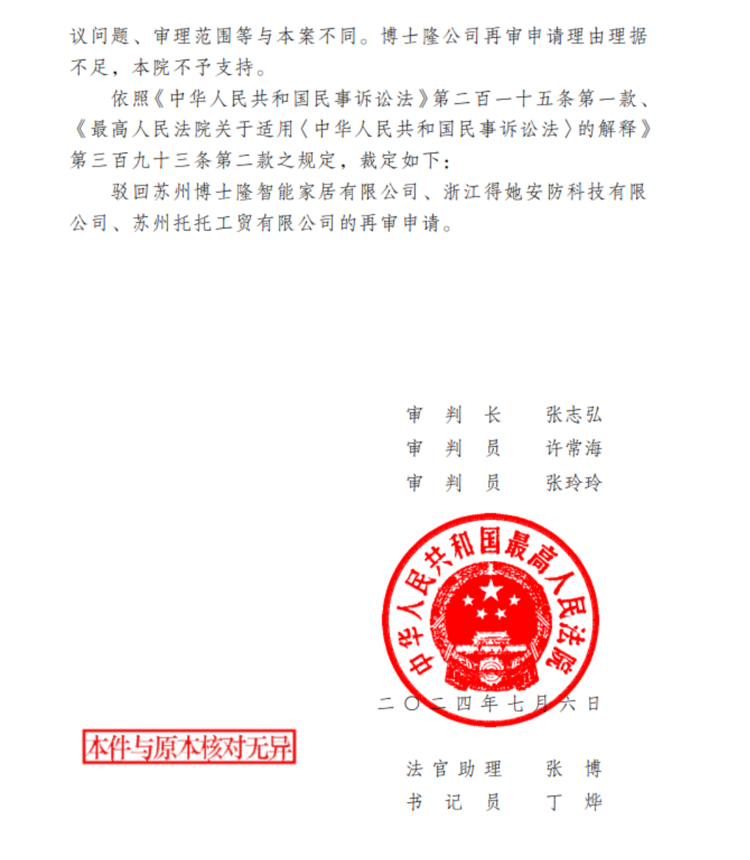 近日,TATA木门微信公众号称,法院对苏州博士隆智能家居有限公司(以下简称:博士隆)、浙江得她安防科技有限公司(以下简称“得她安防”)、苏州托托工贸有限公司侵害北京闼闼同创工贸有限公司(以下简称:TATA木门)商标权及不正当竞争纠纷一案做出(2024)最高法民申161号裁定,驳回博士隆等三公司的再审请求,TATA木门胜诉。