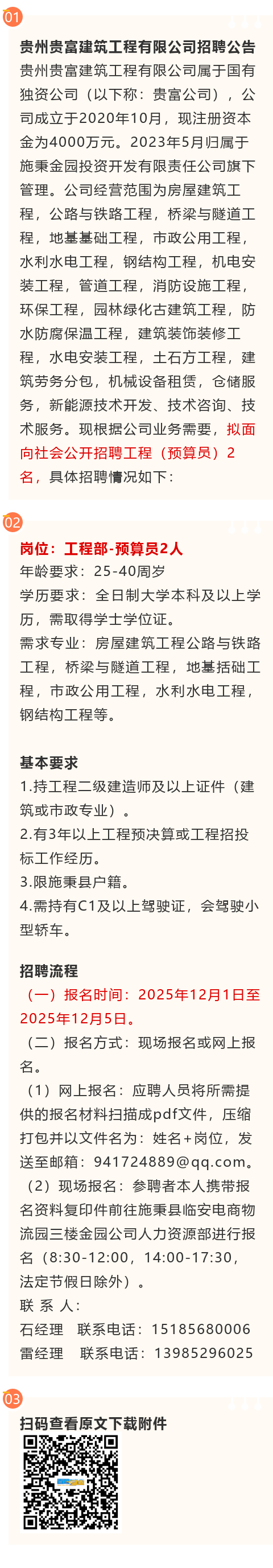 【国企】招聘工程部-预算员!报名截止时间:12月5日!