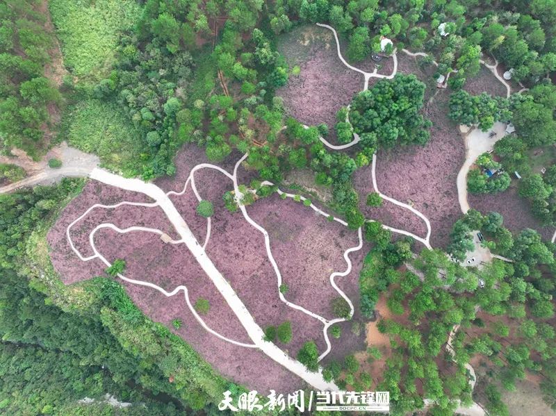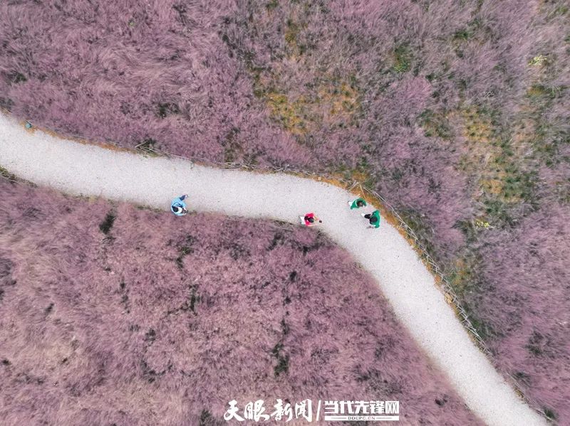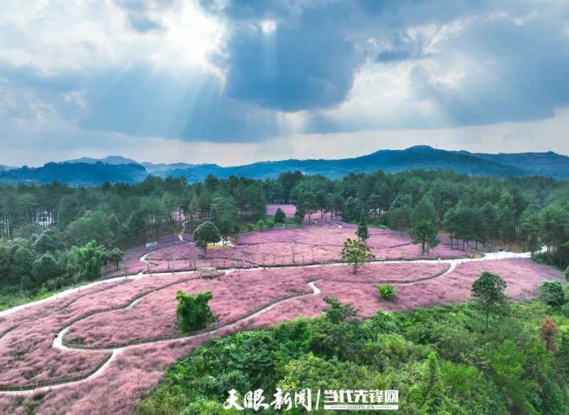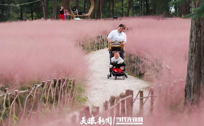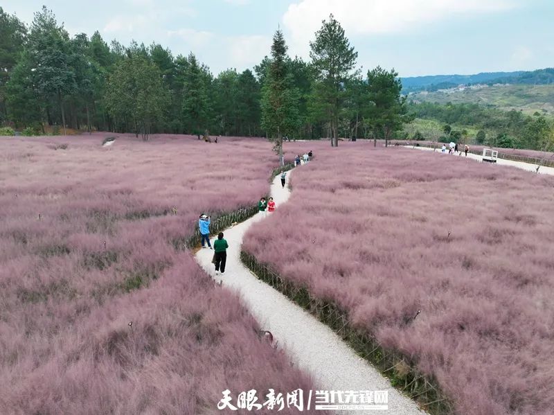 9月27日,独山县拉然小镇,一簇簇粉黛乱子草迎风摇曳,将大地铺成一片温柔的粉色海洋,与周边苍翠的树木完美撞色,白色石子铺就的观赏步道蜿蜒串联,被从栅栏中挤出身子的粉黛装点得若隐若现,如梦似幻。