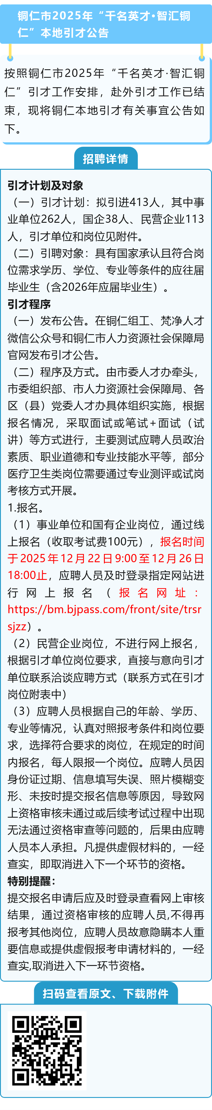 事业单位、国企、民营企业招聘413人!报名时间于2025年12月22日至12月26日!