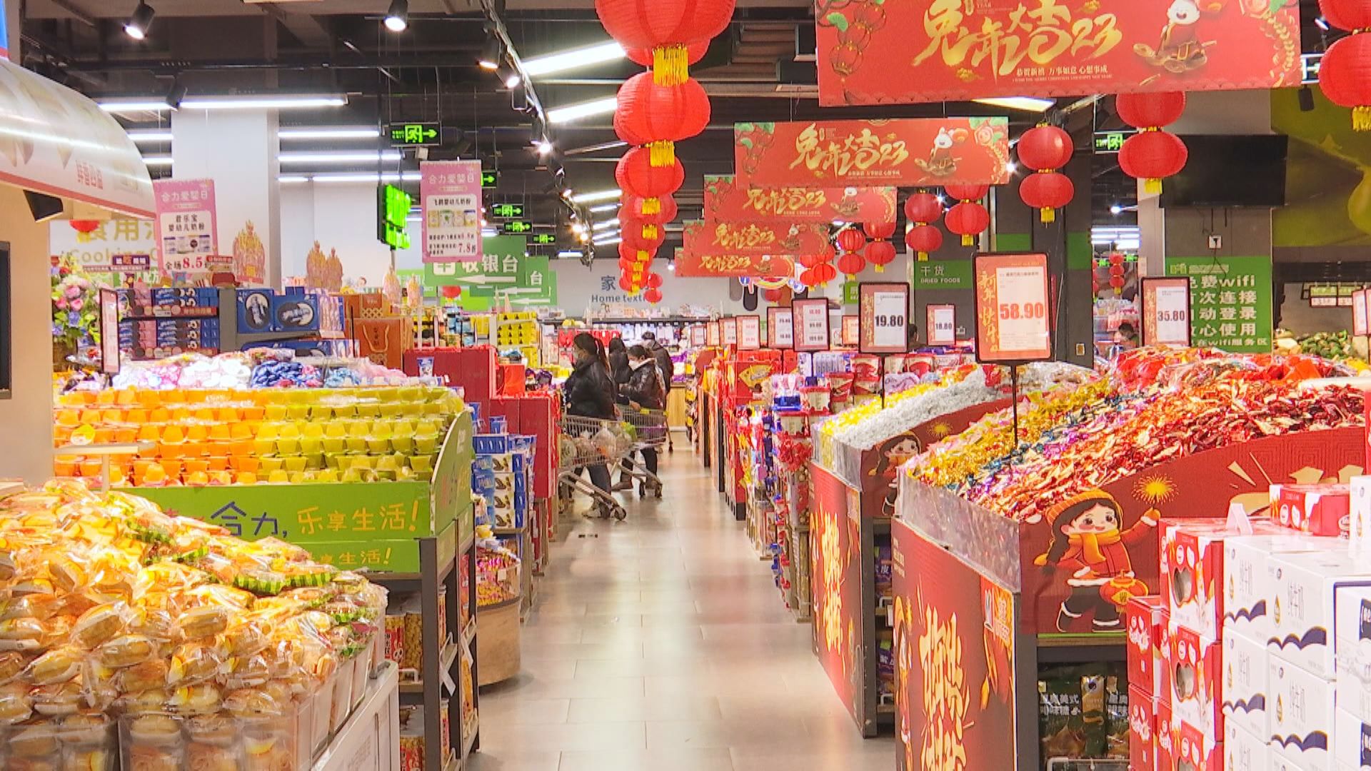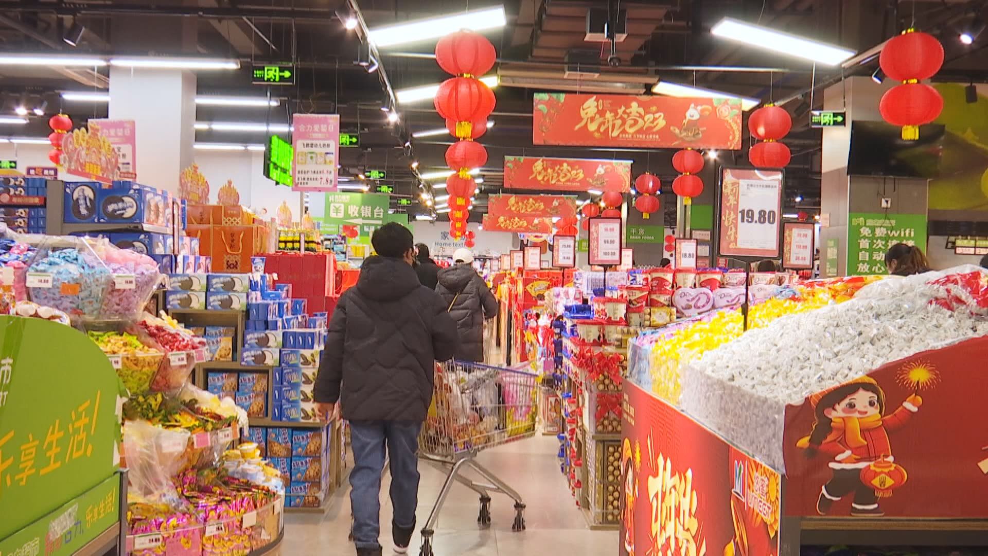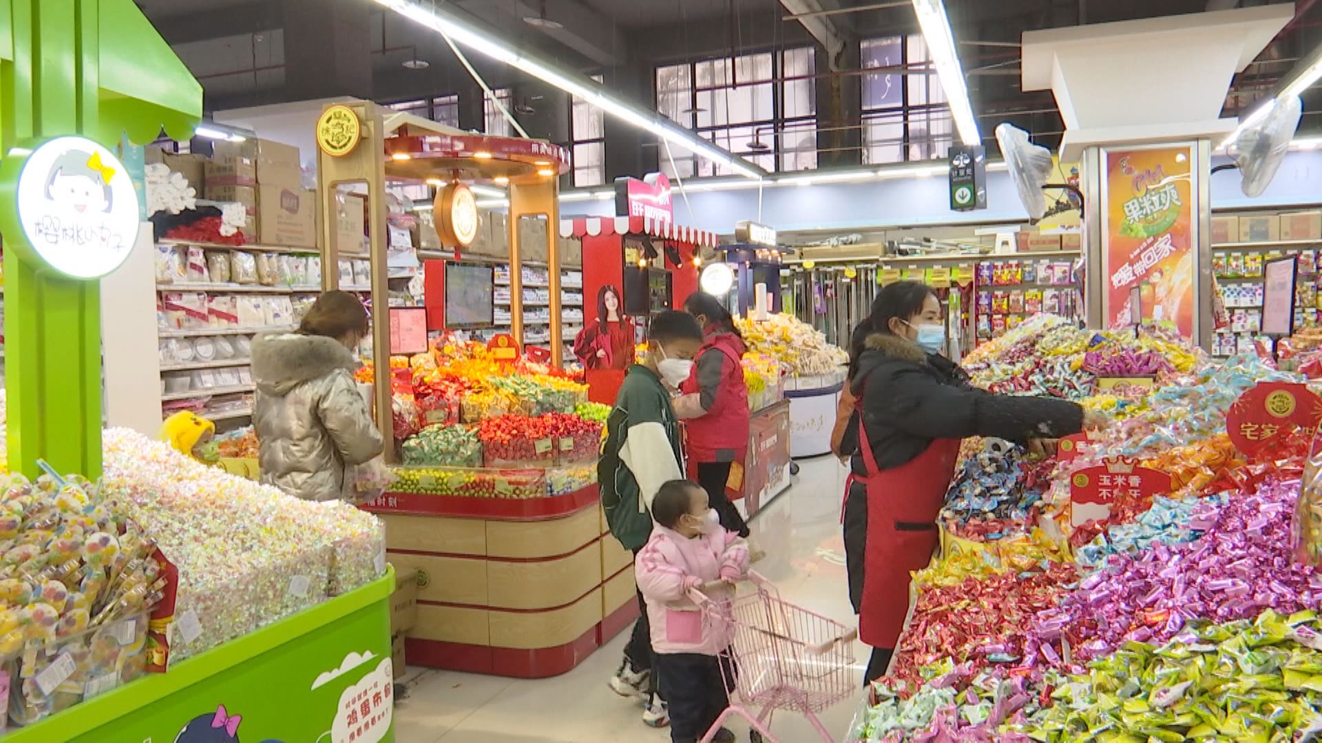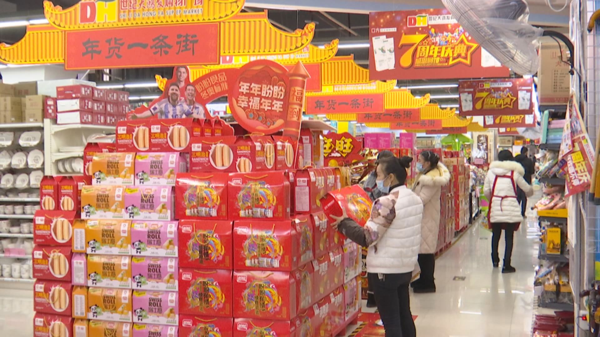 走进安龙世纪大鸿发购物广场,挂满春联、福字、中国结的货架被放置在显眼区域,各式点心、零食礼包也高高摞起形成“年货一条街”,市民们穿梭其中,挑选得不亦乐乎。