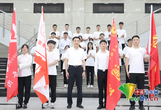 校党委副书记赵水杉为服务基层代表授旗。哈尔滨理工大学团委供图