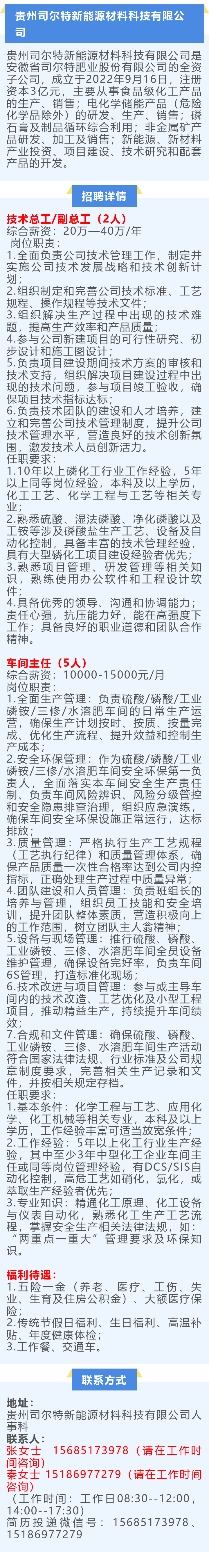 贵州司尔特新能源材料科技有限公司招聘!年薪可达40万!五险一金!