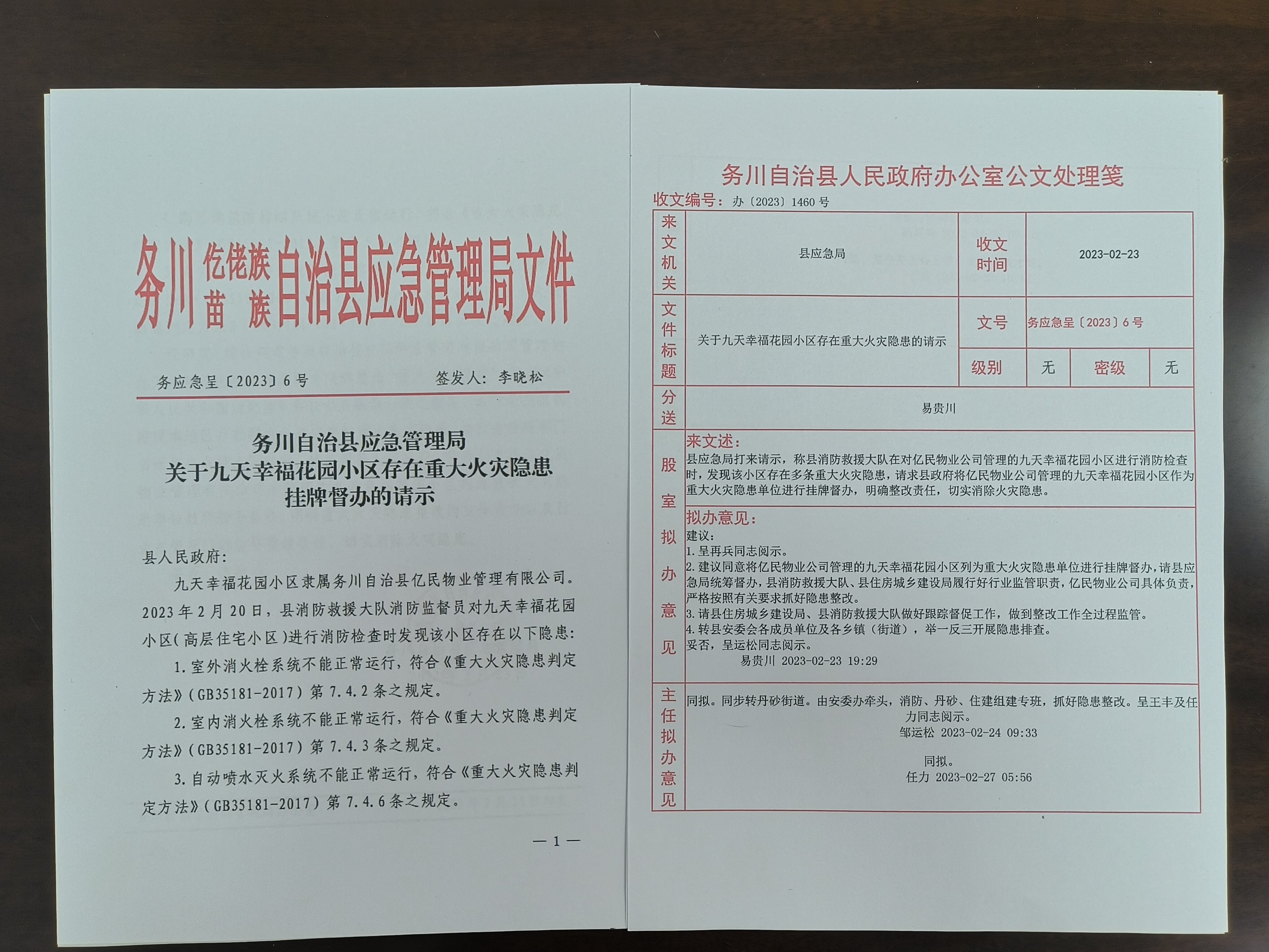 位于对务川自治县亿民物业管理有限公司所管理的九天幸福花园小区进行消防检查时,发现该小区多处火灾隐患:一是室外消火栓系统无法正常运行;二是室内消火栓系统无法正常运行;三是自动喷水灭火系统无法正常运行;四是高层建筑防排烟系统无法正常运行;五是火灾自动报警系统无法正常运行,按照《重大火灾隐患判定方法》综合判定,该小区已构成重大火灾隐患。为了确保该单位严格落实消防安全主体责任,及时有效防范化解重大消防安全风险,大队监督检查人员依据《中华人民共和国消防法》的有关规定和程序,经务川县消防救援大队集体讨论后,综合判定该小区已构成重大火灾隐患并提请务川县人民政府对该重大火灾隐患单位进行挂牌督办整改。