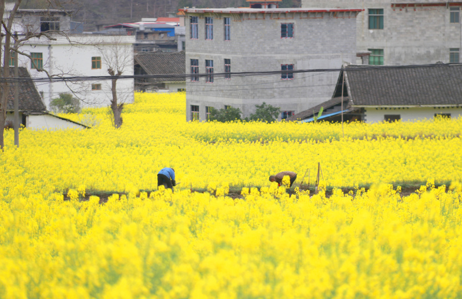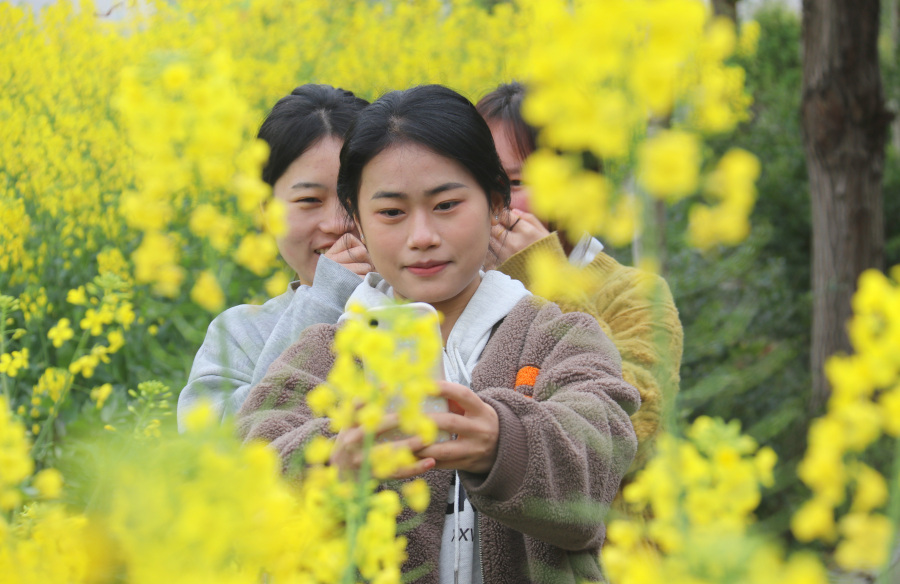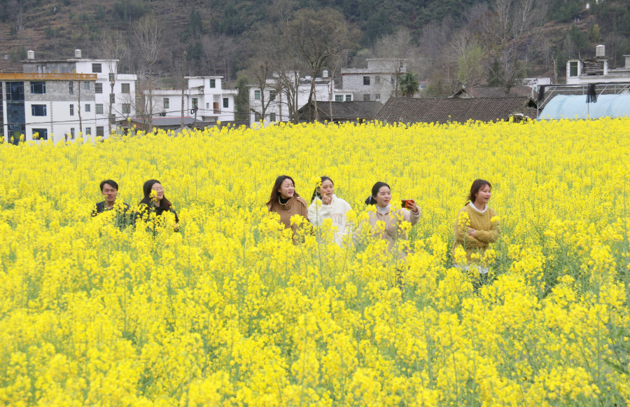 来到该镇市级乡村振兴示范点沙坝村,田间地头油菜花盛开,镶嵌在村庄和青山间,构成一幅美丽迷人的乡村田园风光画卷。三五成群的游客结伴出游,为这个春天增添了不少色彩。