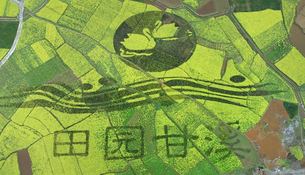 近日,记者来到该镇毛田村520亩油菜示范田,只见一幅以农田为画布,绘画着“田园甘溪”和“天鹅”等图样的“油菜画”壮观而美丽,吸引了过往的群众久久驻足,拍照留恋,记录着这美好的时光。