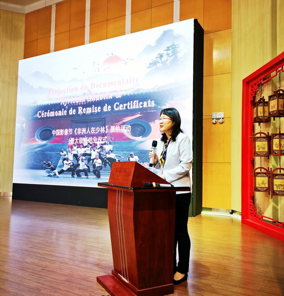 作为本场活动的重头戏,中心为学员们播放了“中国影像节”展映纪录片《非洲人在少林》。该片记录了来自布隆迪、喀麦隆、中非、吉布提、马里、尼日尔和乍得这7个非洲国家的22名武术爱好者来到中国河南嵩山少林寺研修武术的经历。