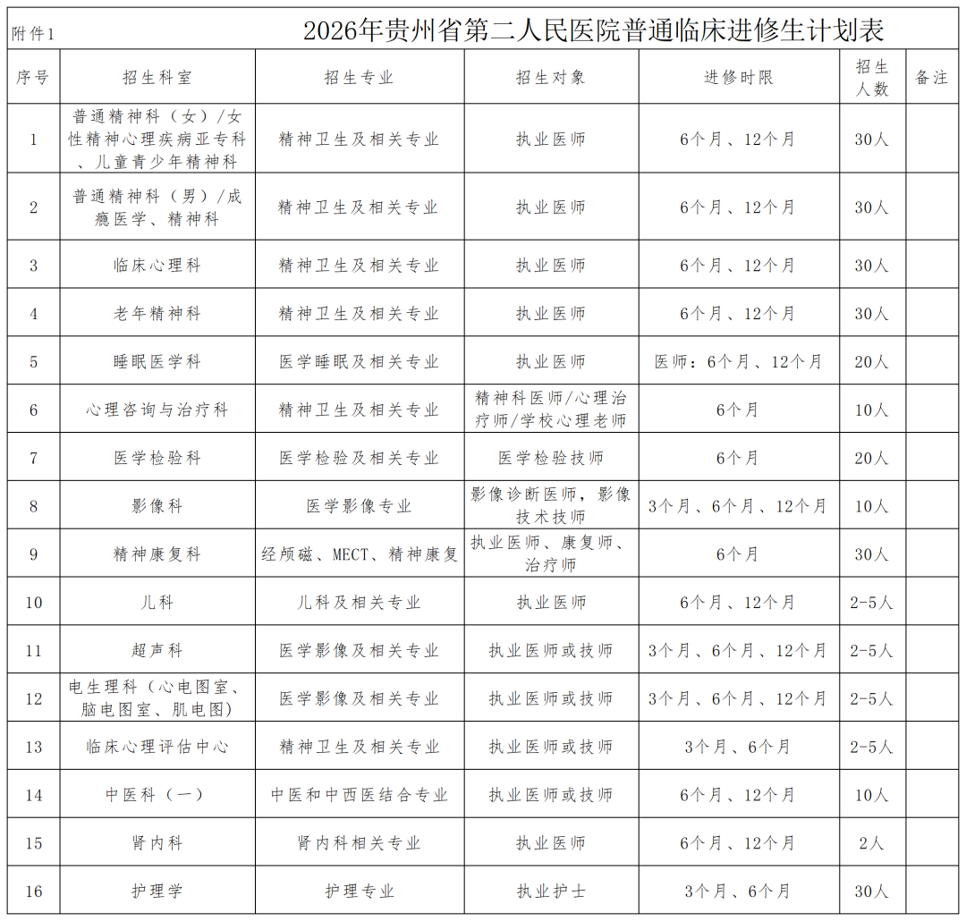 为全面贯彻习近平新时代中国特色社会主义思想与党的二十大精神,认真落实《“健康中国2030”规划纲要》《国家卫健委“十五五”时期工作要点》《国家人口发展规划(2016—2030年)》等政策要求,进一步加强基层卫生人才队伍建设,切实增强基层医疗卫生服务能力,在省委、省政府及省卫生健康委的领导与支持下,我院作为贵州省精神卫生中心,坚持以服务社会、护佑健康为己任,承担着本科及研究生培养的重要职责。面对医药卫生体制改革的不断深化与人民群众对精神卫生服务日益增长的需求,为全面提升基层医务人员在精神疾病预防、诊断、治疗及康复等方面的综合能力,推动精神卫生事业持续健康发展,根据上级有关文件精神及我院工作实际,现面向社会招收2026年度普通临床进修生。具体安排如下: