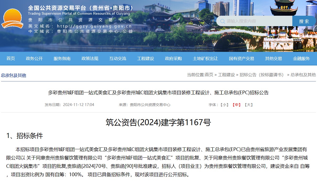 2024年11月12日,贵阳市公共资源交易中心发布多彩贵州城F组团一站式美食汇及多彩贵州城C组团火锅集市项目装修工程设计、施工总承包(EPC)招标公告。