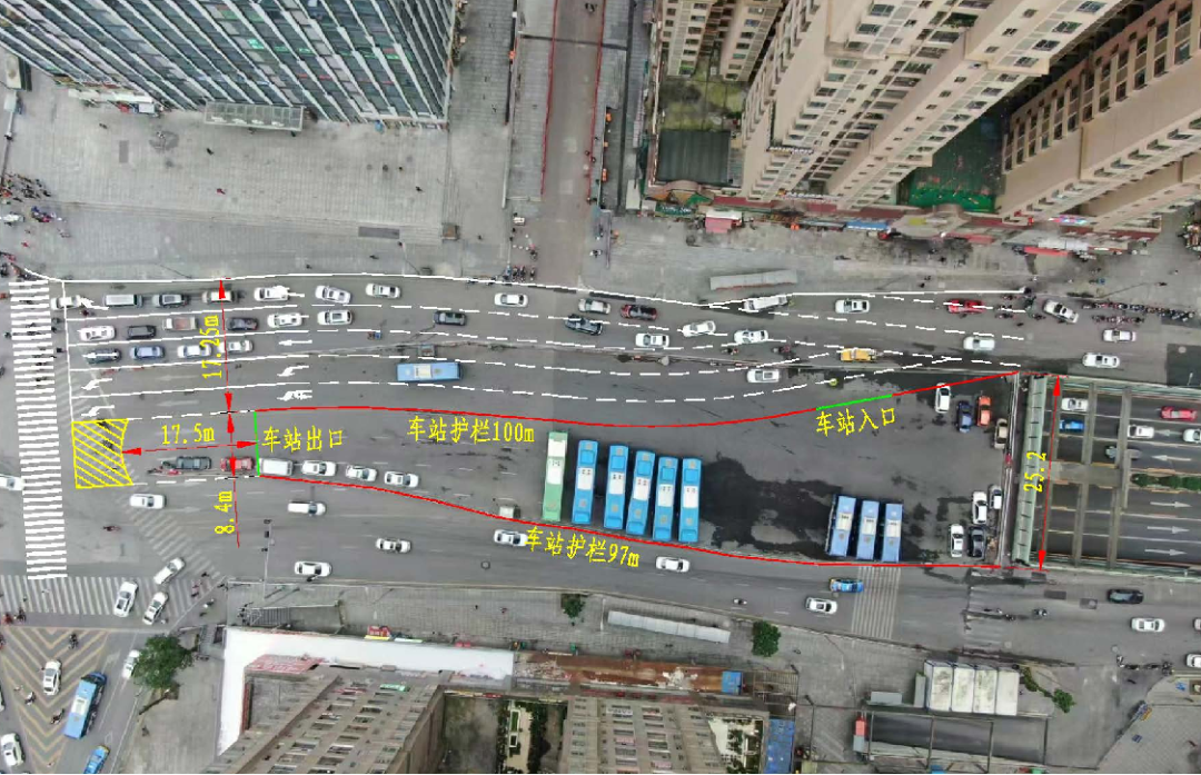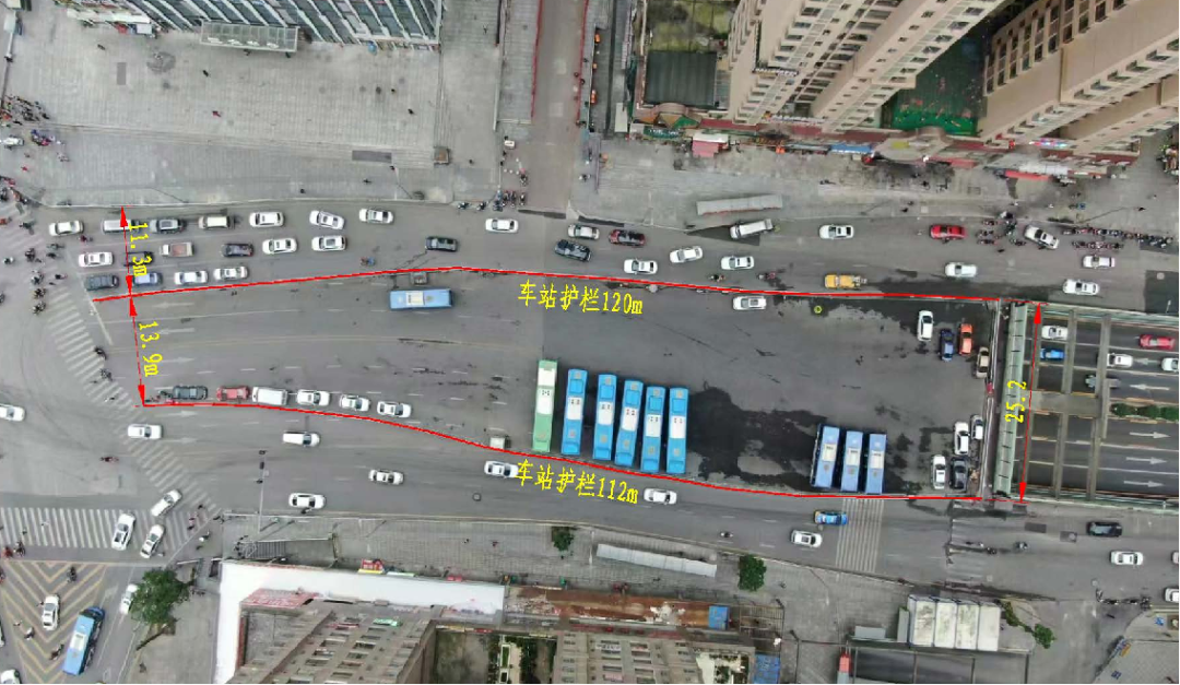 根据前期调研结果,亚太中心公交场站位于延安南路与中山中路交叉口处,由两侧围栏围挡而成,车站南北长约120m,东西宽约25m,占地面积约2465m²。由于公交场站占据了部分车道,导致此路段车行道数量原先最窄处只有双向4车道,降低了此路段的通行能力,造成半山小镇往亚太中心方向路段拥堵。在征求各方意见基础上,南明区制定了以缩减场站面积为主的改造方案,根据方案,将对场站面积进行缩减,将原来的场站围栏进行改移,对设置的隔离墙进行拆除,减少场站占地面积,拓展后延安南路段将变为双向7车道,路口处变为8车道,恢复路段车道原本通行能力,增加车辆通行效率,改善拥堵情况。场站缩减后长度约为100m,平均宽度约为16m,占地面积为1540m²,公交车通行改为单进单出,基本保证公交场站的使用要求。