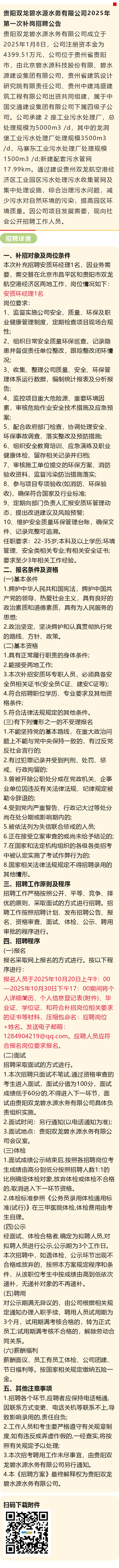 【国企】贵阳双龙碧水源水务有限公司招聘!报名截止时间:10月30日!