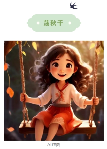秋千,意即揪着皮绳而迁移。它的历史很古老,最早叫千秋,后为了避忌讳,改为秋千。古时的秋千多用树桠枝为架,再拴上彩带做成。后来逐步发展为用两根绳索加上踏板的秋千。荡秋千不仅可以增进健康,而且可以培养勇敢精神,至今为人们特别是儿童所喜爱。