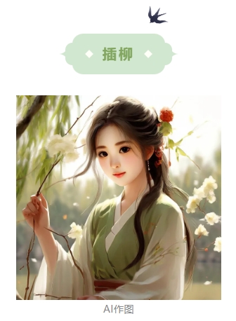 清明节是杨柳发芽抽绿的时间,民间有折柳、戴柳、插柳的习俗。人们踏青时顺手折下几枝柳条,可拿在手中把玩,也可编成帽子戴在头上,也可带回家插在门楣、屋檐上。插柳的习俗与避免疫病有关。唐人认为在河边祭祀时,头戴柳枝可以摆脱毒虫的伤害。宋元以后,人们踏青归来,往往在家门口插柳以避免虫疫。