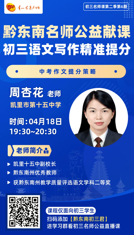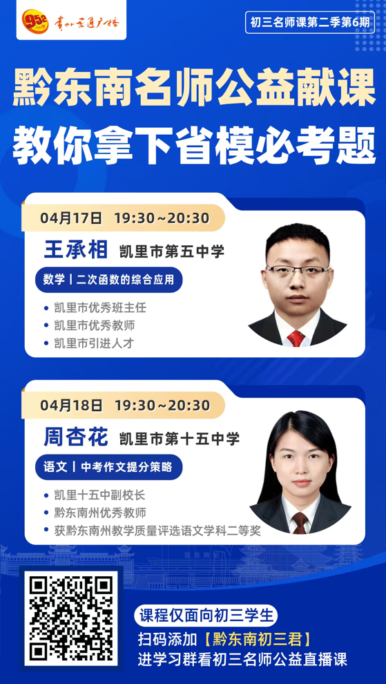 • 初三学子:扫码添加【黔东南初三君】,进入学习群获取直播入口,观看初三名师公益直播课
