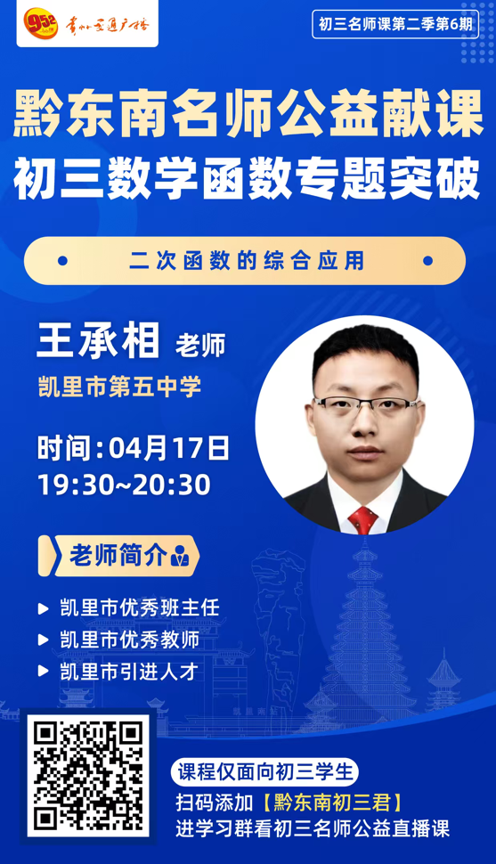 凯里市第五中学王承相老师,将带来《二次函数的综合应用》专题精讲。作为凯里市优秀班主任、优秀教师,同时也是凯里市引进的骨干人才,王老师深耕初中数学教学多年,对中考二次函数的命题规律、省模高频考点有着精准透彻的把握。本次课程将系统拆解综合题型的解题逻辑,梳理解题思路与得分技巧,帮初三学子筑牢数学提分根基,轻松攻克省模核心难点。