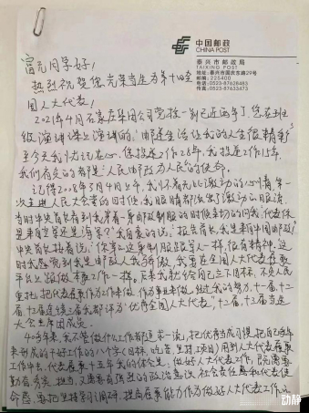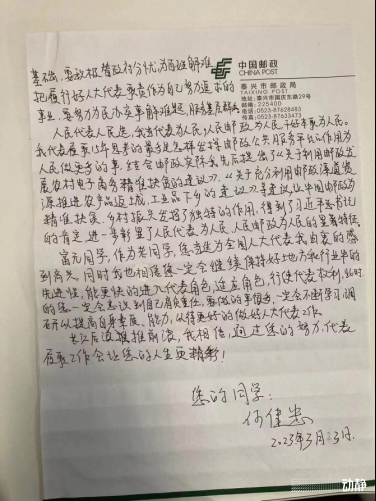 “富元同学好,热烈祝贺您光荣当选为第十四届全国人大代表。我作为代表履职15年,思考得最多的是怎样发挥邮政公共服务平台的作用,为人民做更多的事......”洋洋洒洒两页纸的信件,成为了两位新老代表的履职“接力棒”。