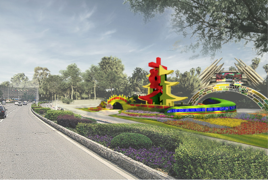 绿雕整体长19.09米、宽8.74米、高8.57米,采用"十字型"立体结构,实现行人与车辆的全视角覆盖。正反两面以甲秀楼剪影融入"林"字造型,体现生态内涵;左右两侧饰以"爽"字造型,传递城市气质;同时搭配苗族人物雕塑、"56"民族变形"华"字小品及高铁绿雕等元素,生动展现民族融合与高质量发展理念。