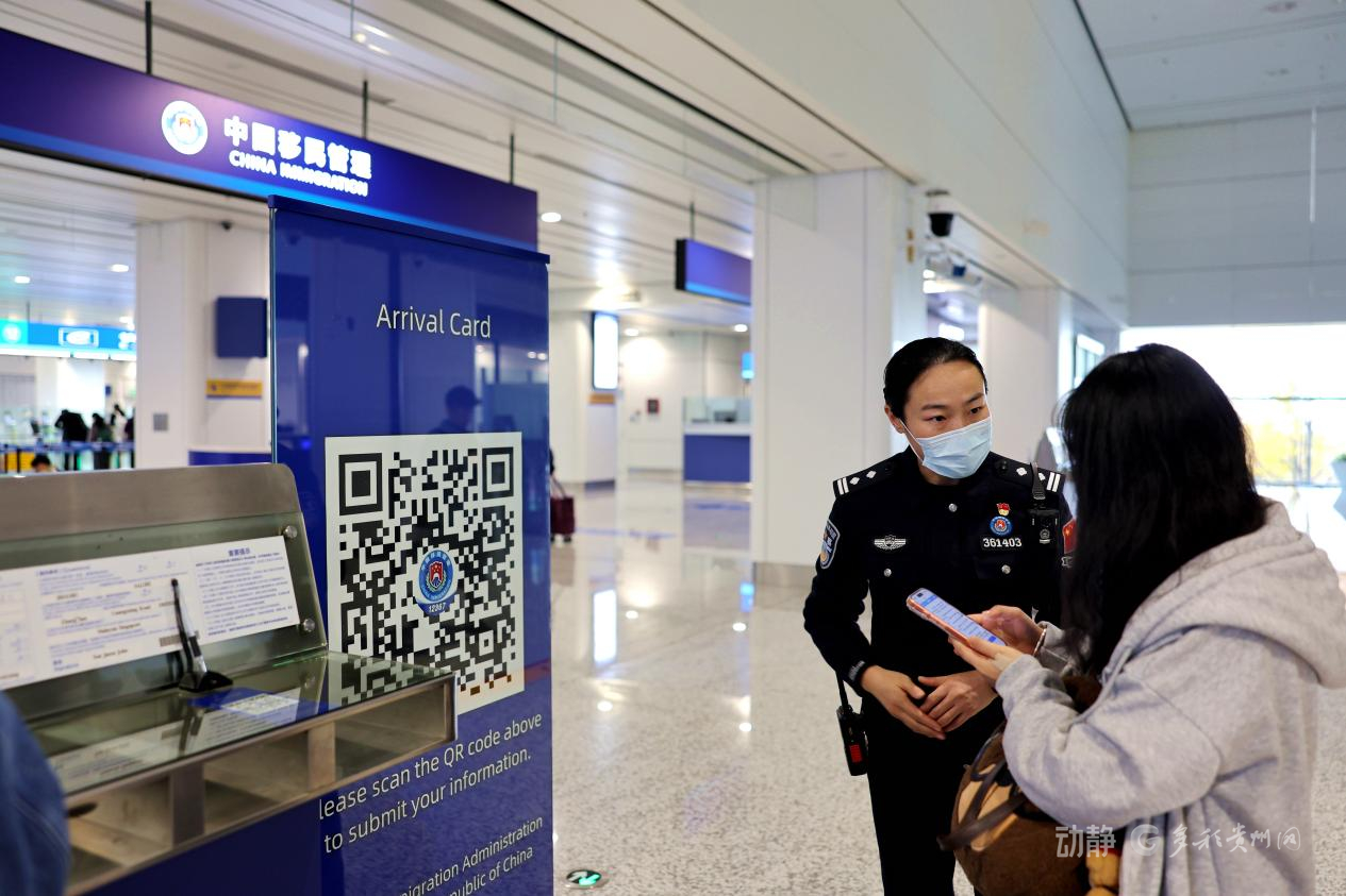在贵阳龙洞堡国际机场口岸入境大厅,边检执勤现场秩序井然,现场设置了清晰的中英文指引标识,LED屏幕滚动播放填报流程示意图,边检民警在咨询台提供多语种讲解帮助。对于尚未提前填报信息的外国旅客,边检民警主动引导其使用手机扫描二维码完成线上填报,同时保留纸质卡片作为备用选项,充分满足不同旅客需求。