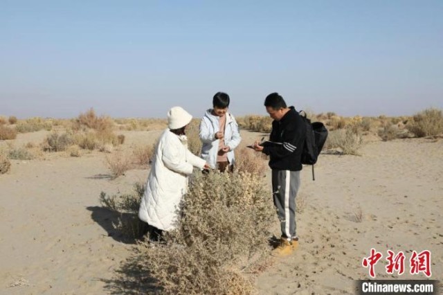 谢小云(中)在沙漠中查看四翅滨藜长势。郑亮 摄