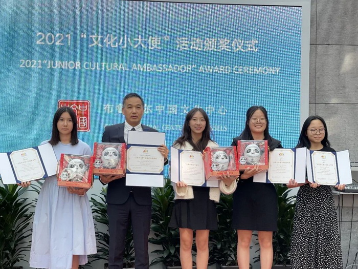 在2021中国宋庆龄基金会“文化小大使”活动中,由布鲁塞尔中国文化中心推荐的王心慧、杜玉、拿威艾玛等3位比利时小朋友,经过初审、网络投票和专家评审,从各国参赛者中脱颖而出,分获“文化小大使”称号、优秀奖和人气奖。布鲁塞尔中国文化中心获得“文化小大使”活动优秀组织奖。