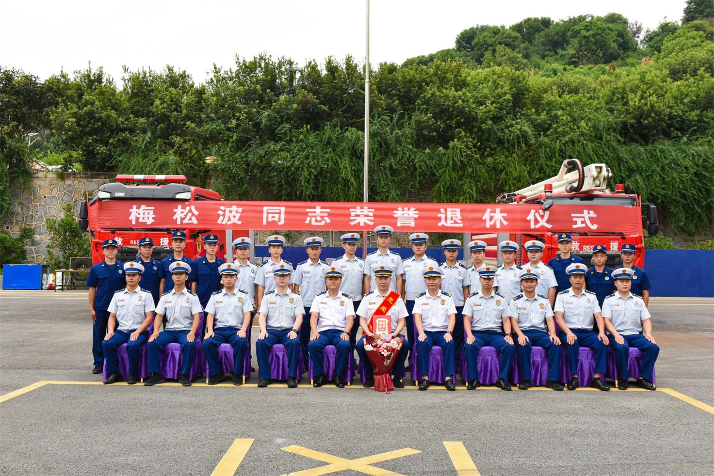 经开消防救援大队充分肯定和衷心感谢梅松波多年的辛勤付出与无私奉献,代表全体指战员向他送上鲜花和纪念品,致以美好祝福。仪式结束后,梅松波与参会全体人员合影留念。