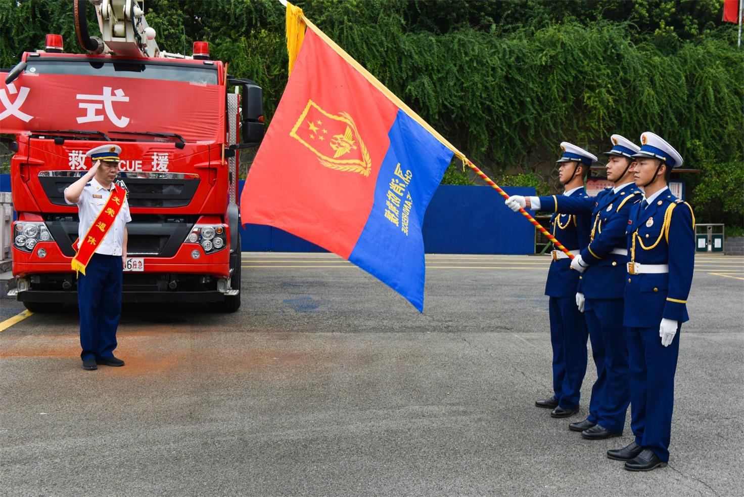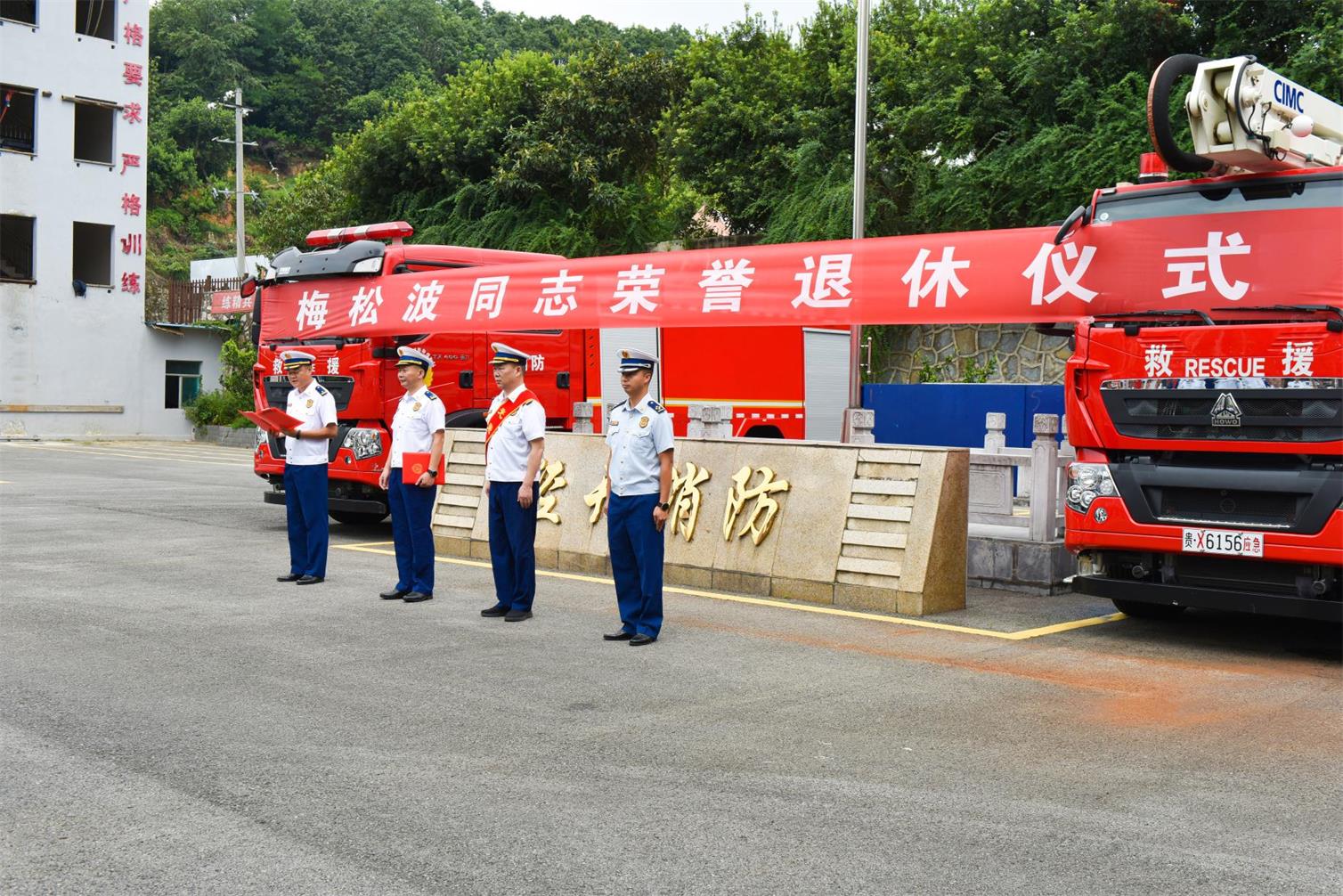 8 月 16 日,贵阳市消防救援支队经开大队为梅松波同志举行退休仪式,向这位 “戎马” 三十二载的同志送上真挚祝福。仪式上,梅松波与朝夕相处的队友深情相拥。