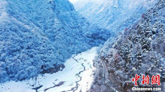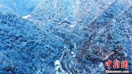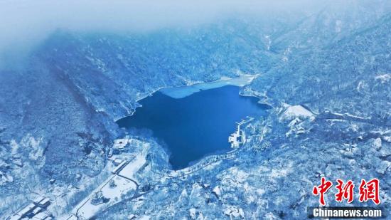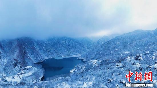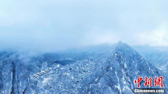 近日,受冷空气影响,陕西西安气温骤降,秦岭山区出现降雪天气。群山在云层中若隐若现,皑皑白雪给山体上的植被再次披上“银装”,翠华山上的天池宛如蓝色宝石,画面静谧唯美。图为西安翠华山雪景。