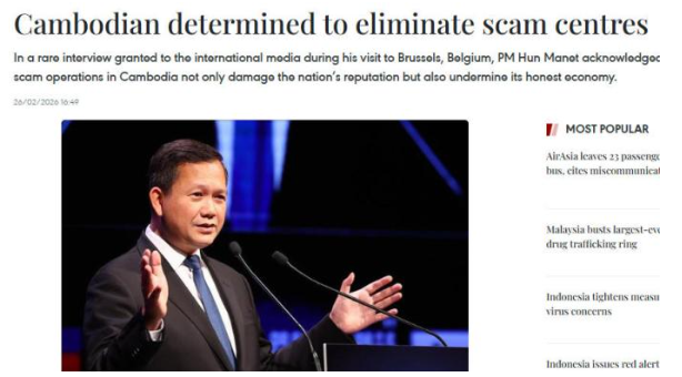 2月18日,柬国务大臣兼国家打击网络诈骗委员会秘书长柴西纳列向26国驻柬使节等通报打击电信诈骗进展,表示打击电诈是柬第七届王国政府持续推进的核心国家战略,并非阶段性行动。目前,柬方已建立由首相洪玛奈亲自领导的国家级打击网络诈骗机制,强化跨部门协同执法,提升整治成效。
