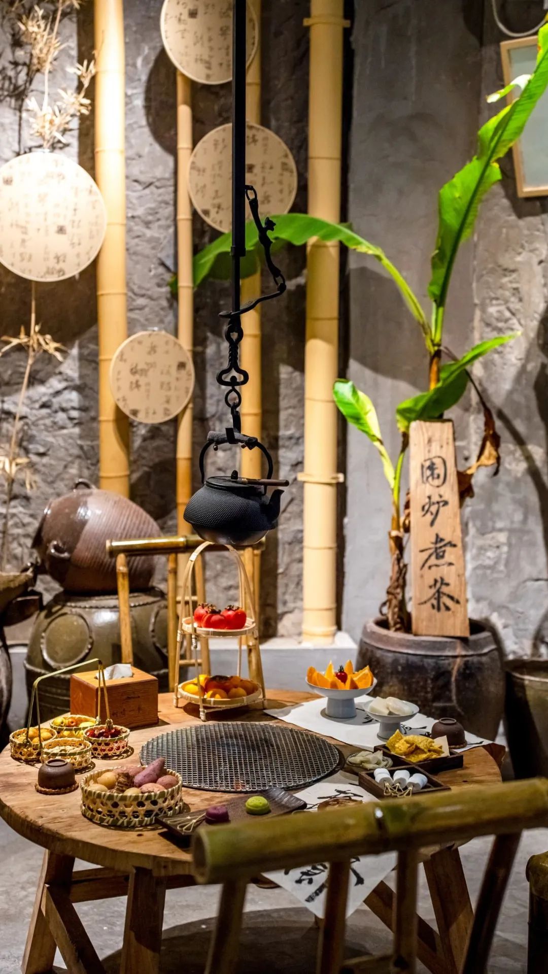 一入座,诗意的氛围扑面而来,古式蒲扇、茶盏的点缀,加之砂糖橘、板栗、红薯、年糕等,围炉煮茶的“常见嘉宾”,在幸会·围炉煮茶,安逸与舒适度直接拉满。