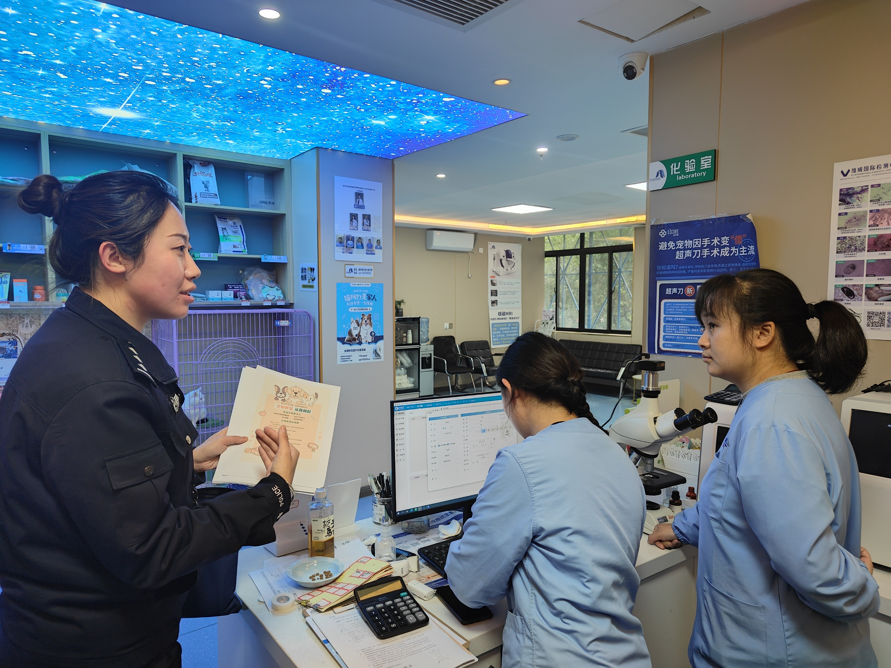 活动中,社区民警充分利用宣传手册,详细讲解了养犬登记、电子标识植入流程及犬只疫苗接种等内容,着重强调遛犬“要牵绳”、粪便及时清理等文明行为规范,引导养犬群众树立责任意识。