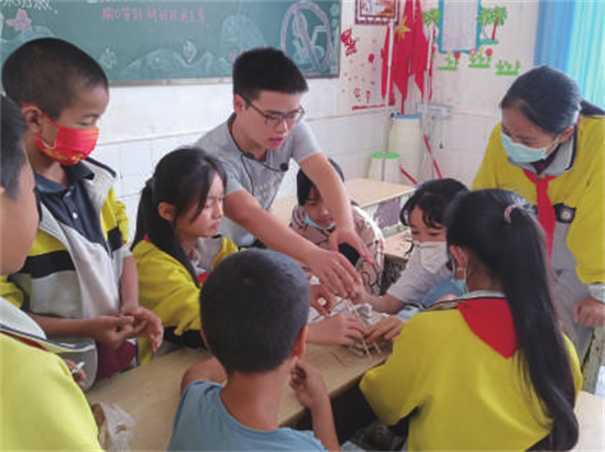 研支团成员揭建龙在手工课上指导学生建造房屋模型。受访者供图