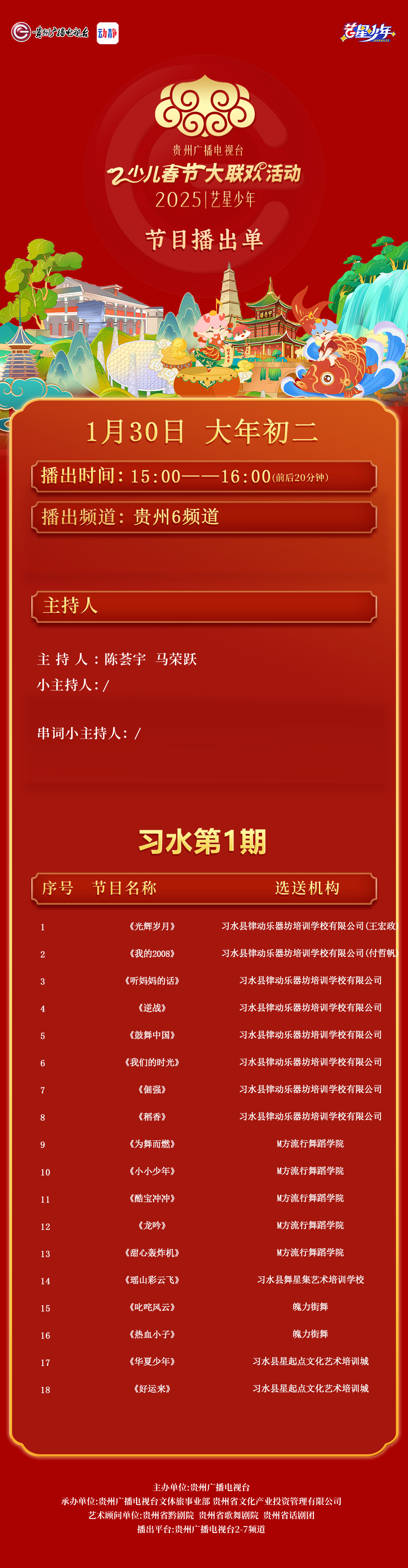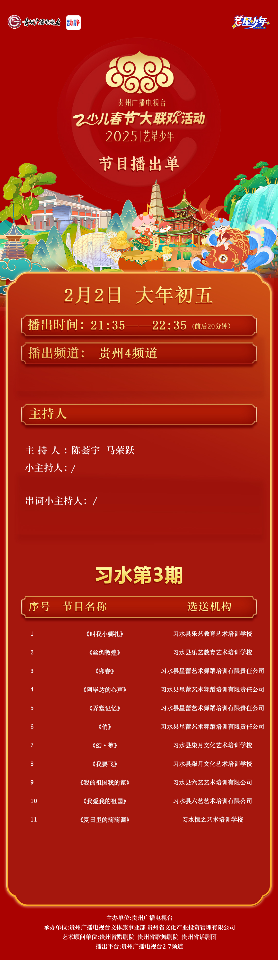 【习水播出通知】贵州广播电视台2025艺星少年少儿春节大联欢活动——节目播出通知!!!