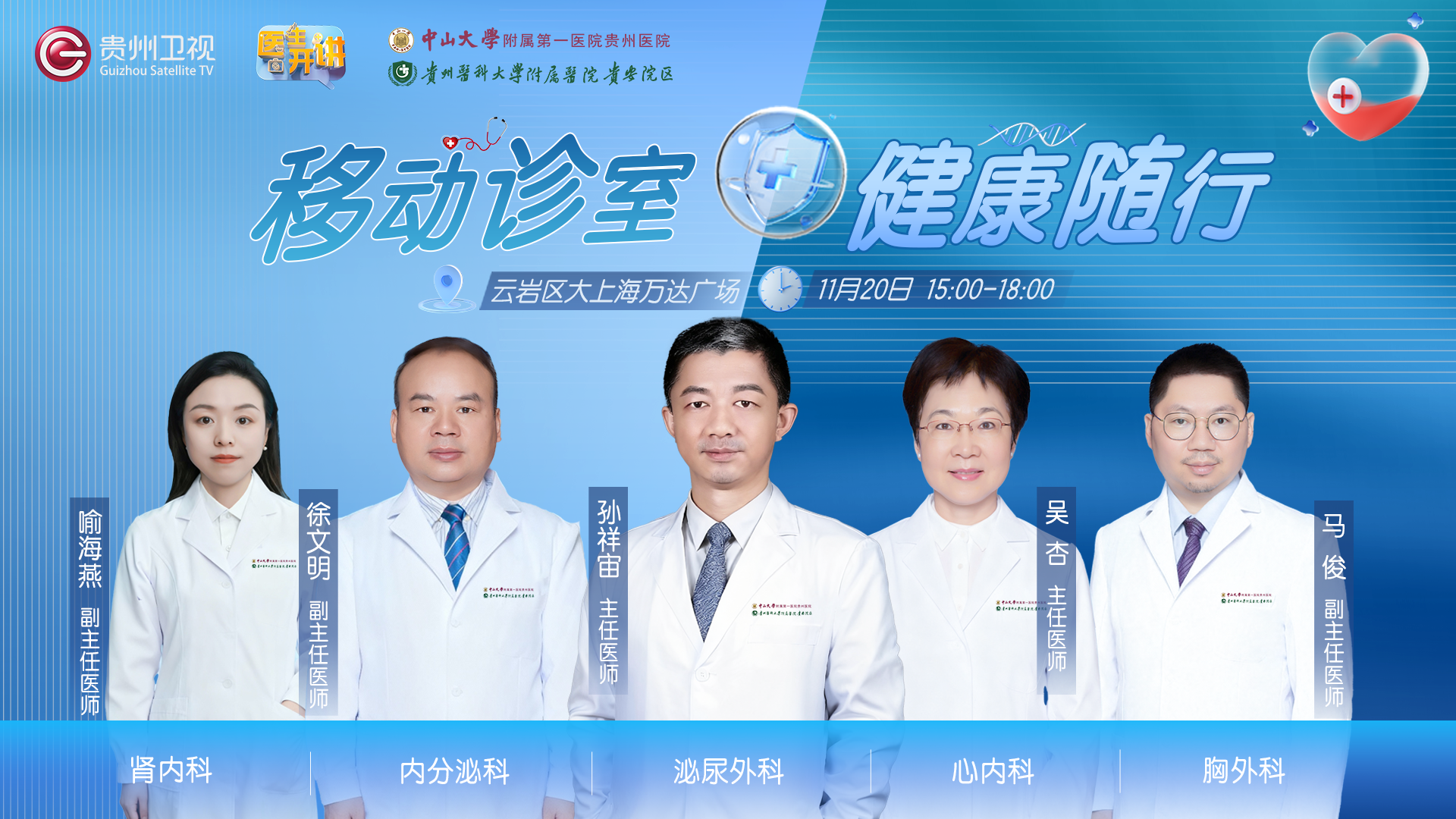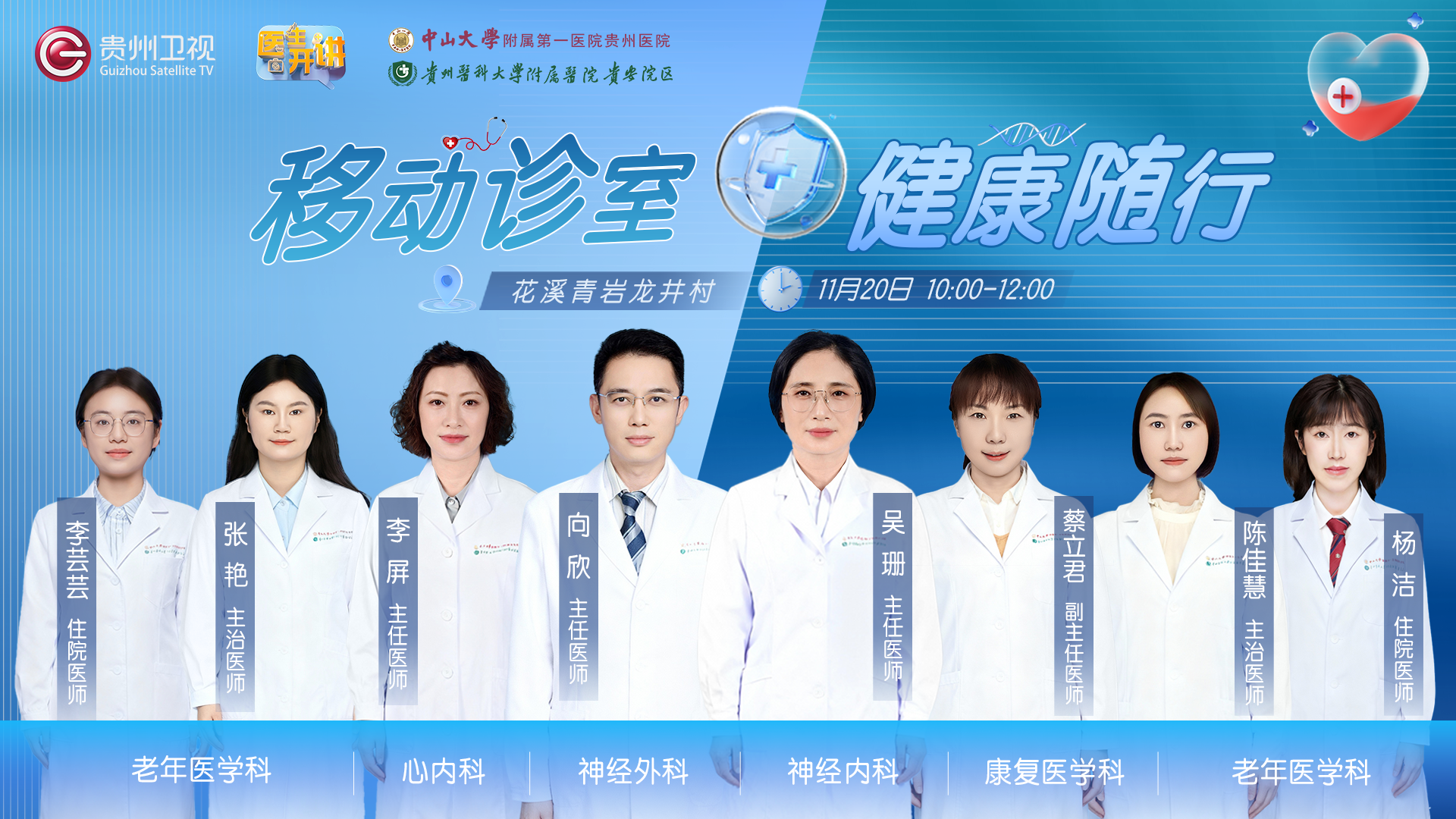 为深入推动健康贵州建设,提升基层医疗服务可及性,11月20日,贵州卫视《医生开讲》栏目组联合中山大学附属第一医院贵州医院、贵州医科大学附属医院贵安院区,共同开展“移动诊室 健康随行”大型户外义诊活动。活动当天,义诊团队将分别走进贵阳市花溪区青岩龙井村与云岩区大上海万达广场,将国家区域医疗中心的优质医疗资源直接送到群众“家门口”。