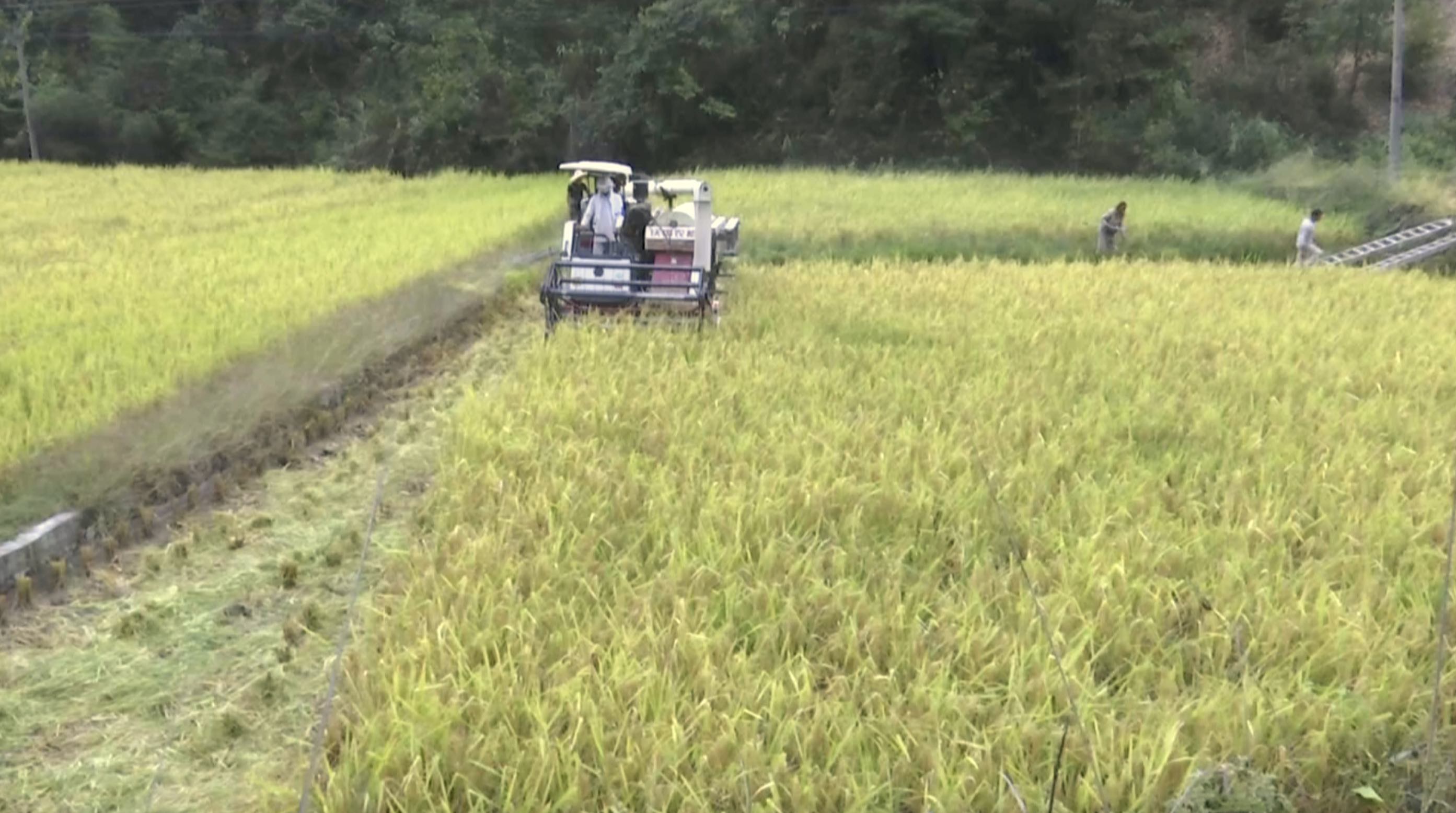 记者在朗洞镇往宰岑公路边看到,田野稻谷飘香,金色稻浪随风起伏,稻田里,一台大型收割机在田间来回穿梭,紧张作业。