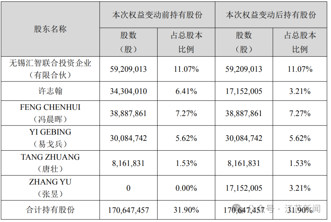 本次权益变动后,许志翰直接持有公司无限售条件流通股份1715万股,占公司总股本的3.21%。张昱无条件且不可撤销地将其持有的公司股份对应的全部表决权、提名和提案权、参会权、监督建议权以及除收益权和股份转让权等财产性权利之外的其他权利全权委托给许志翰行使。