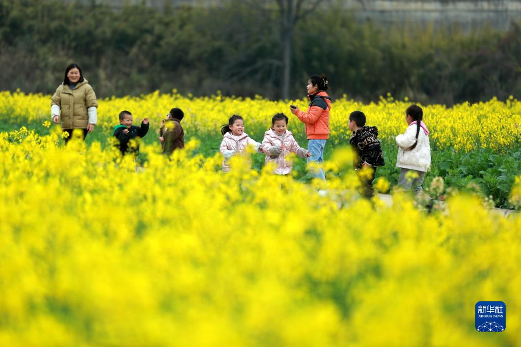 2月12日,游人在贵州省都匀市小围寨街道马尾村油菜花田游玩。新华社发(肖伟摄)