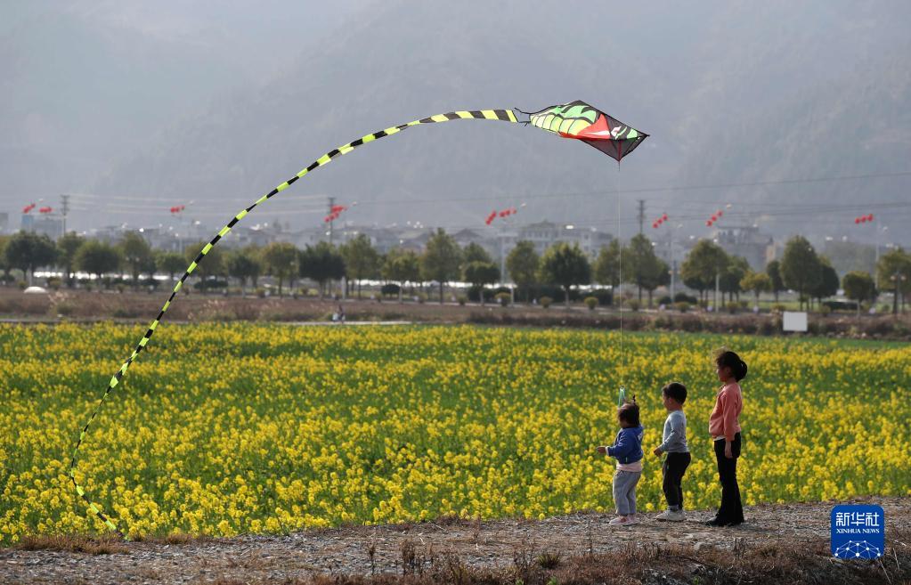 2月12日,小朋友在贵州省黔东南苗族侗族自治州榕江县古州镇车江坝区油菜花田边放风筝。新华社发(李长华摄)