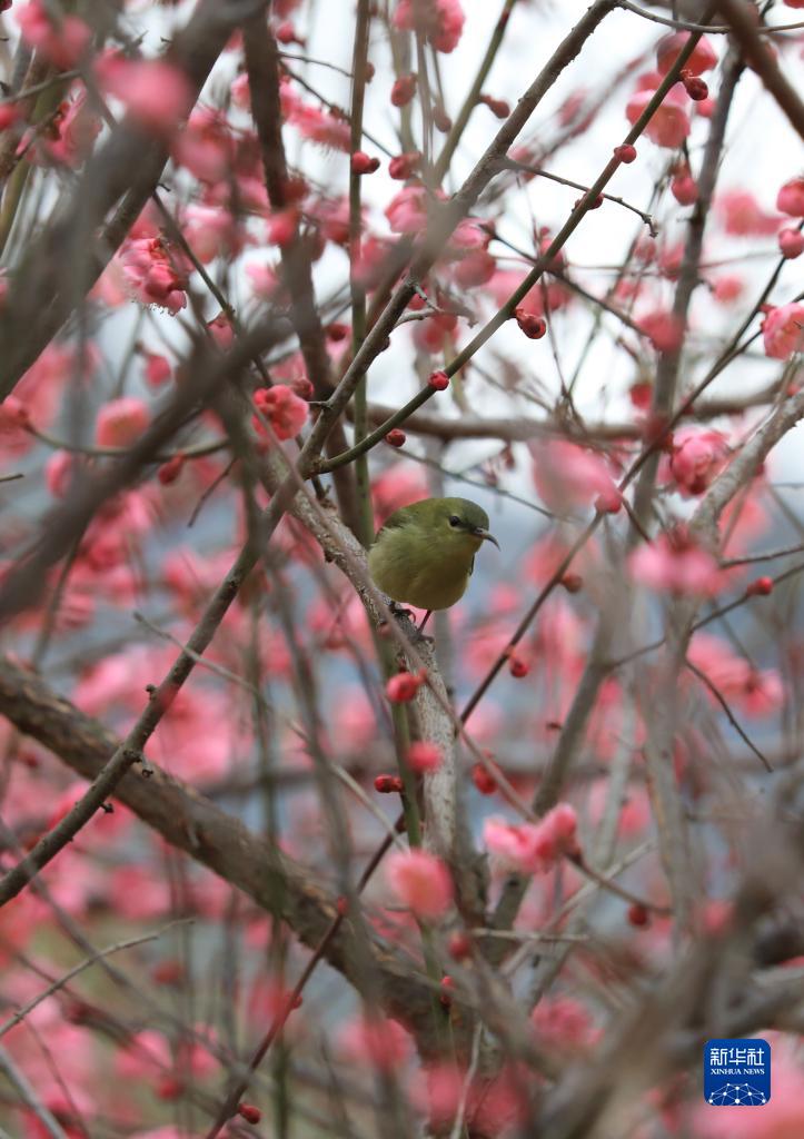 2月12日,鸟儿在贵州省铜仁市江口县太平镇云舍村湿地公园梅花丛中栖息。新华社发(李鹤摄)