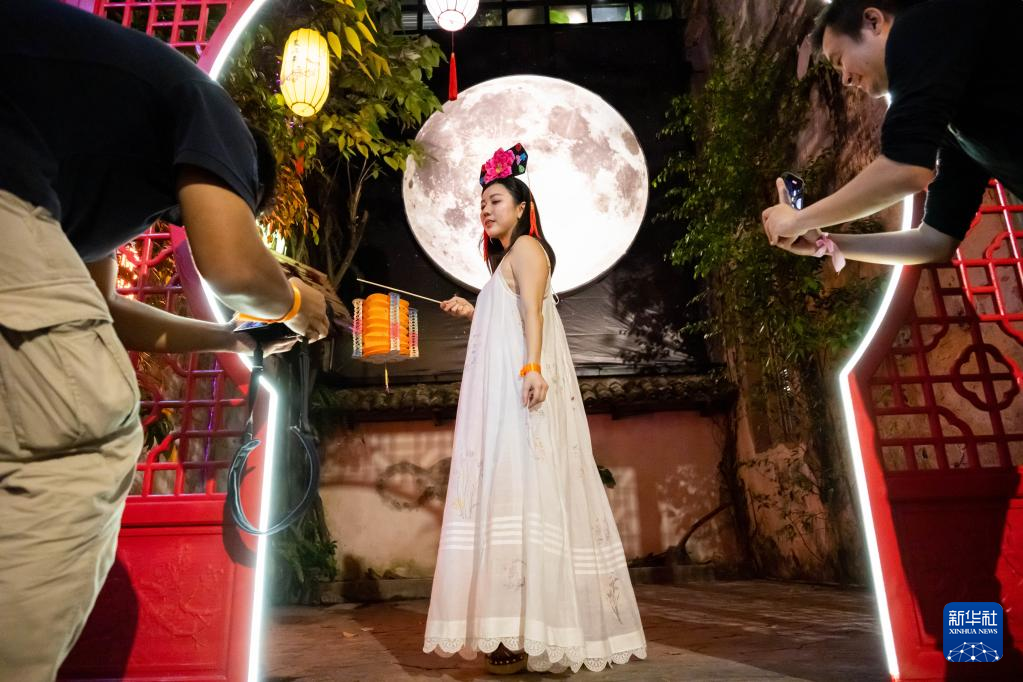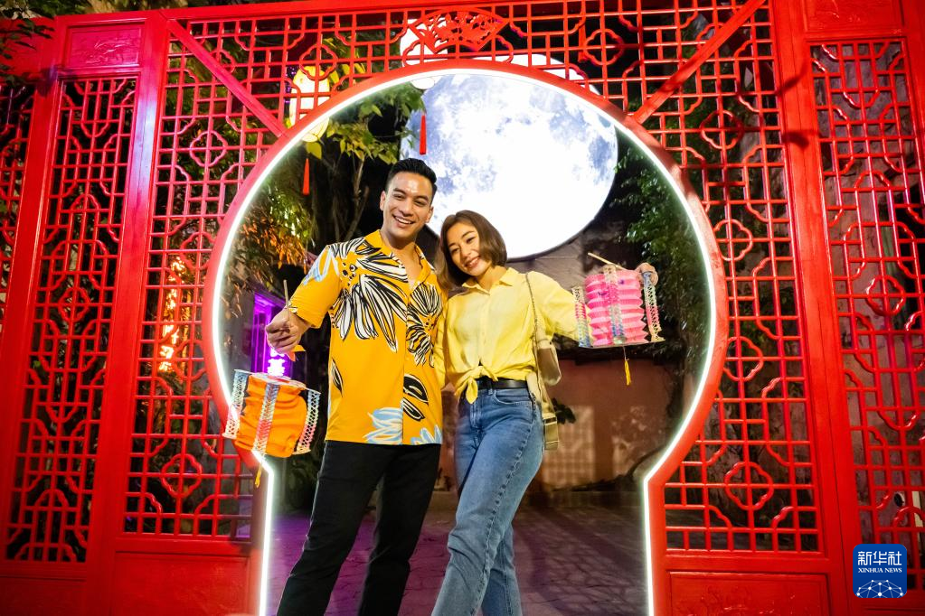 8月25日,人们在马来西亚吉隆坡鬼仔巷的“超月门窗”艺术装置旁留影。