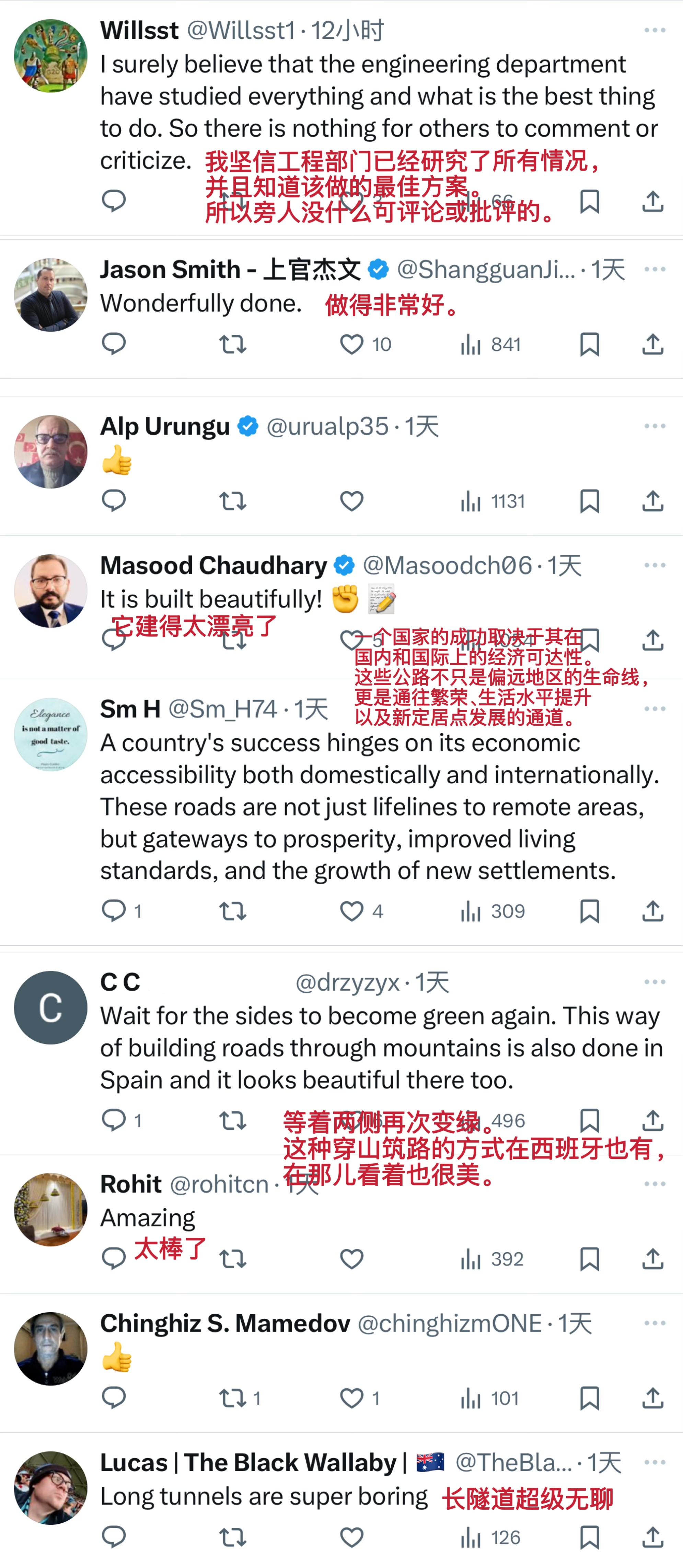 回复内容:“Thanks for the interest in Huajiang Grand Canyon Bridge in Guizhou! Some asked why a bridge was built instead of a tunnel. I looked into it—complex terrain, higher costs, and safety concerns made tunneling impractical. The bridge was the smartest, most appropriate choice.”(中文:感谢大家对贵州花江峡谷大桥的关注!有网友问为什么建桥而不是挖隧道。查阅后发现,由于地形复杂、成本更高且存在安全隐患,隧道并不适合。建桥是最明智、最合适的选择。)