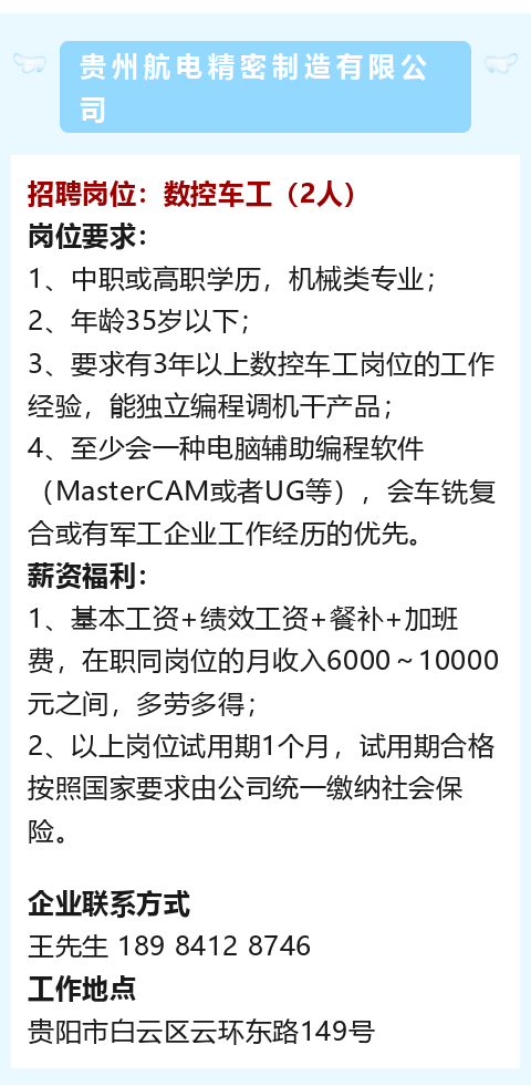 贵阳市白云区招聘数控车工!月薪6000-10000元!中职起报!