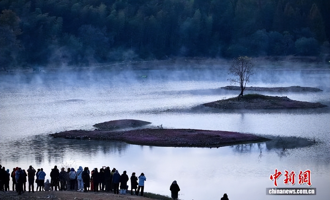 2025年11月19日,游人在安徽省黄山市黟县奇墅湖畔观赏晨景。(无人机照片) 中新社记者 韩苏原 摄