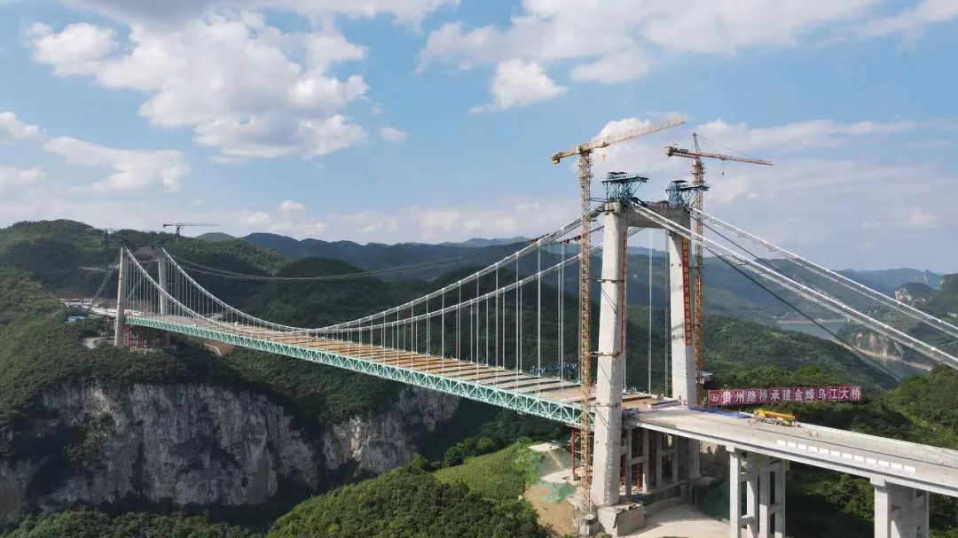 ▲贵阳至金沙高速公路重要控制性工程——金烽乌江大桥,10日完成最后一片钢桁梁安装,顺利合龙。大桥全长1473.5米,是贵州省内第一座采用预制索股法施工的超宽(六车道)钢桁梁悬索桥,设计时速100Km/h。