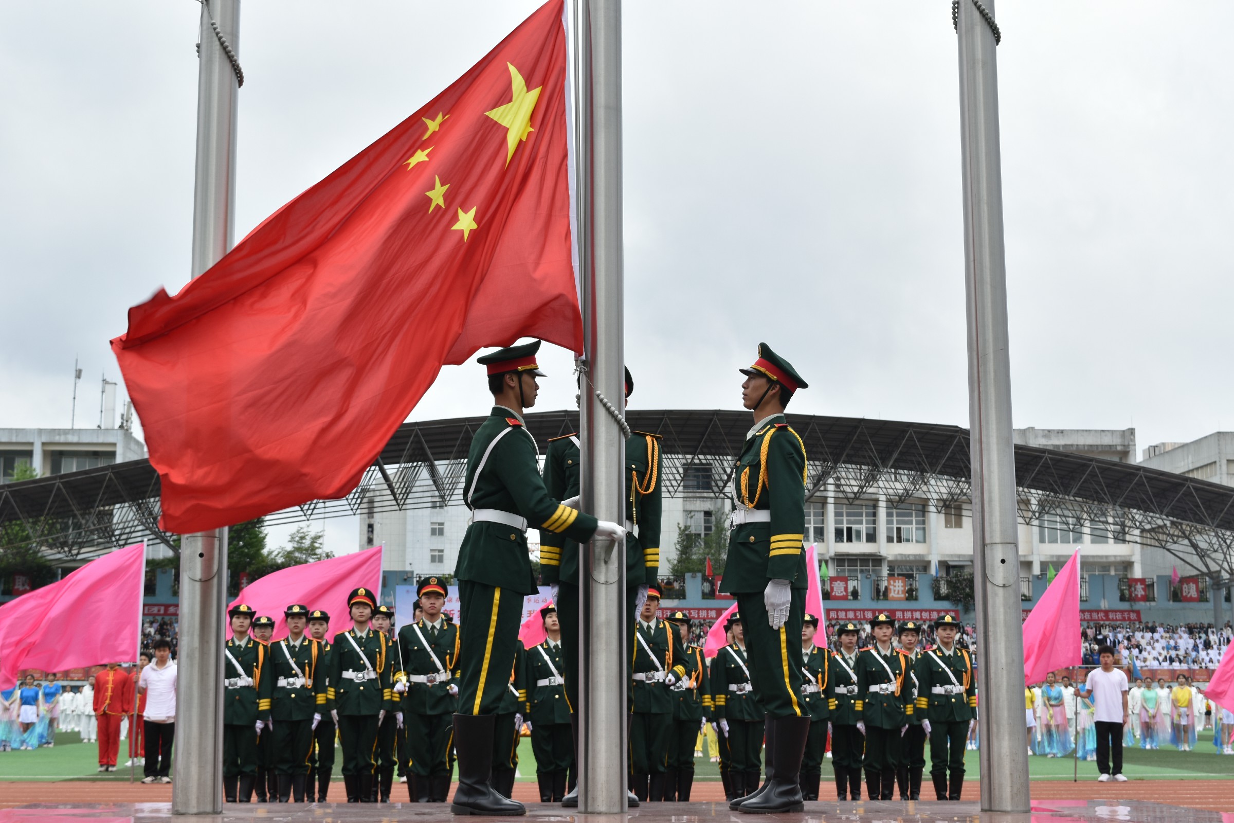 升国旗,奏唱国歌!五星红旗随着悠扬的国歌声,徐徐升起,全体师生精神饱满,庄严肃穆,向国旗行注目礼。