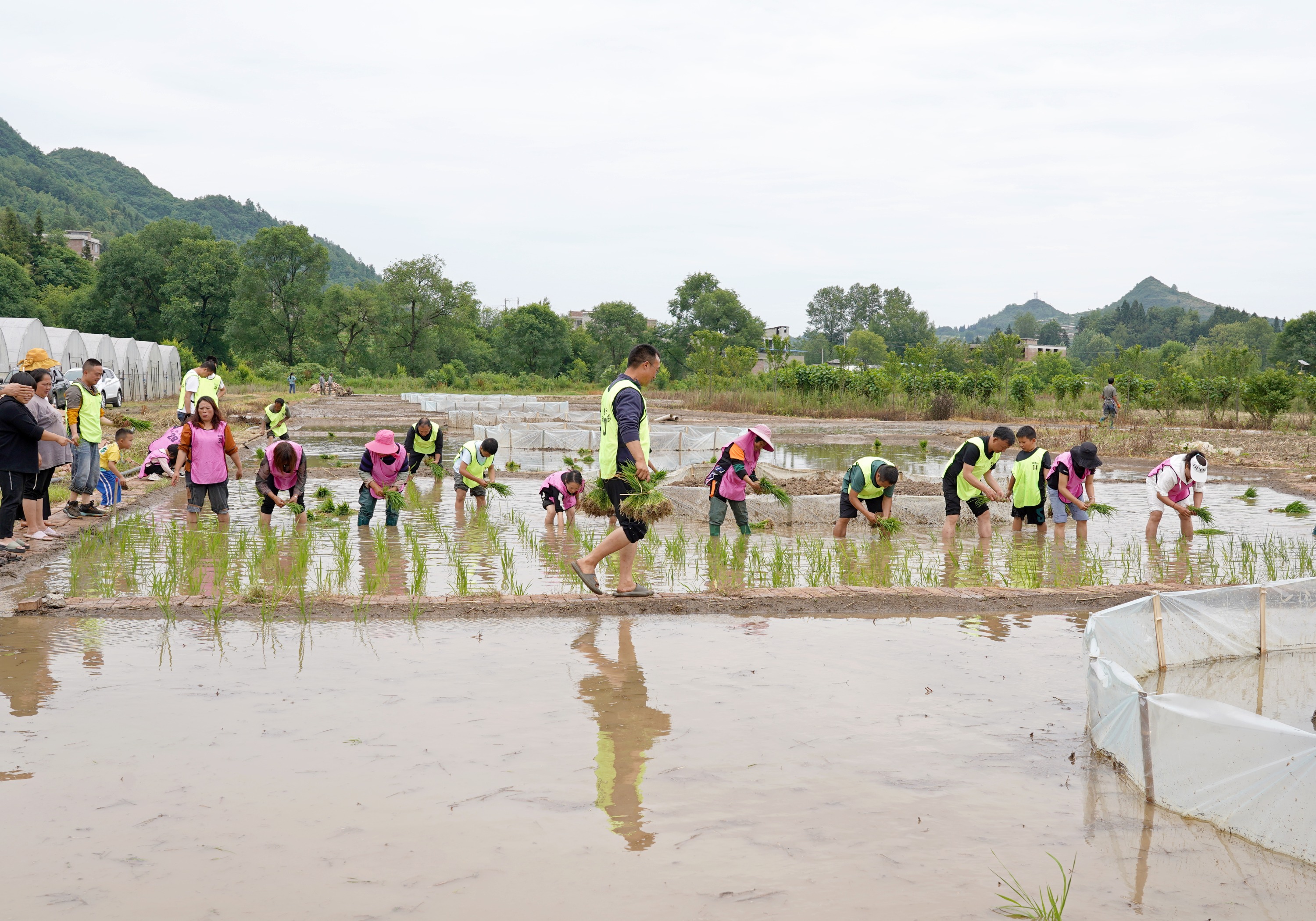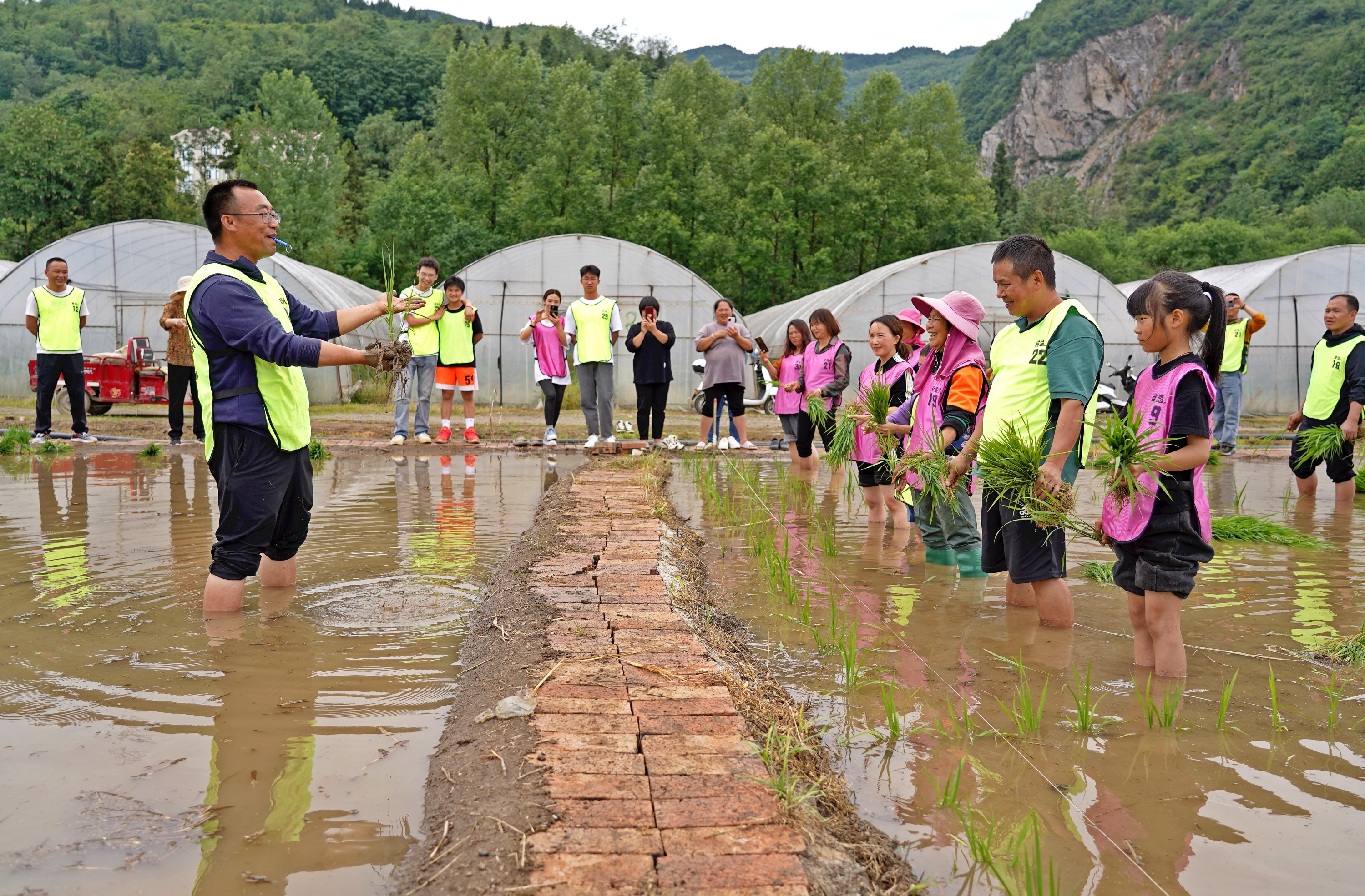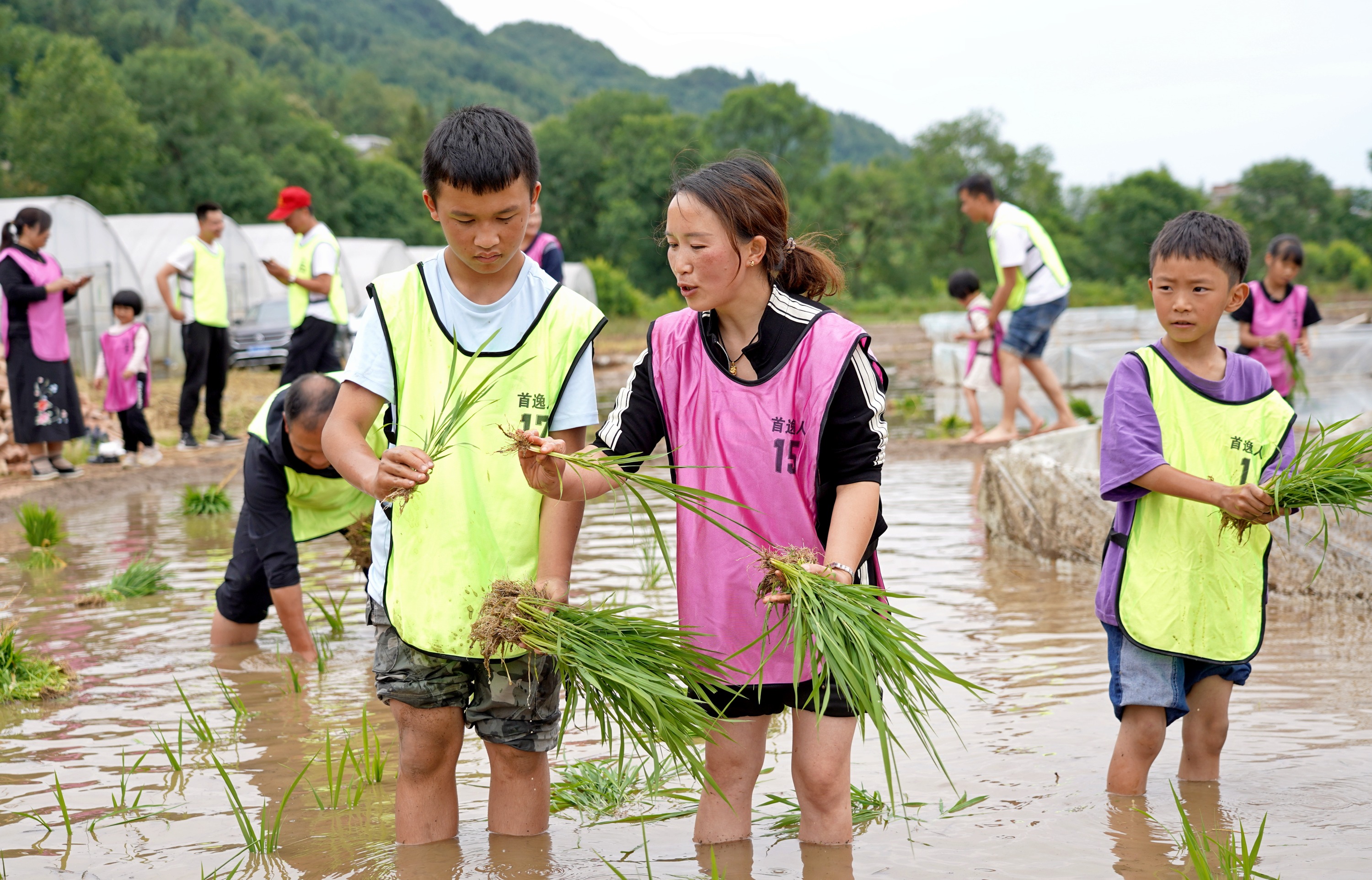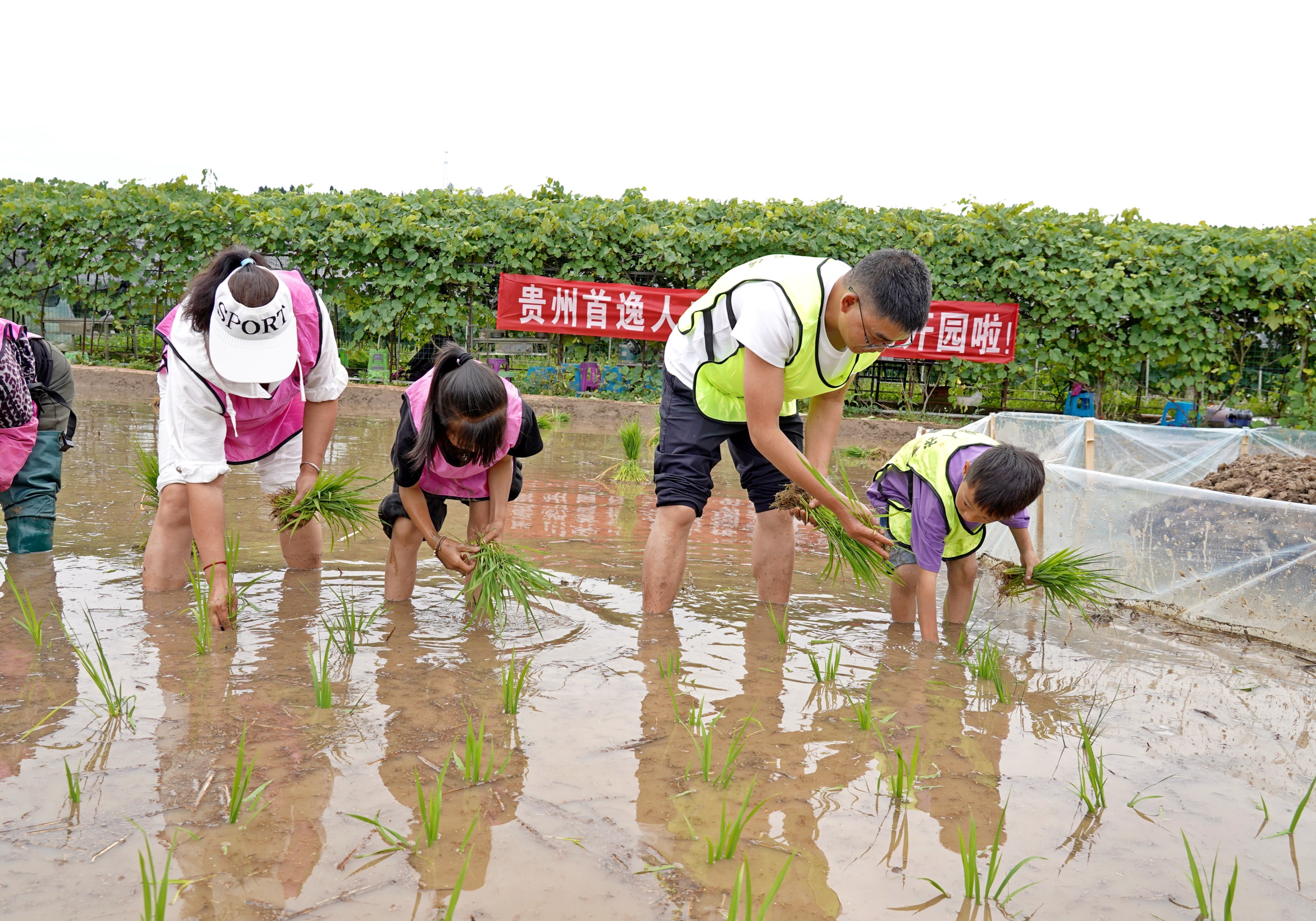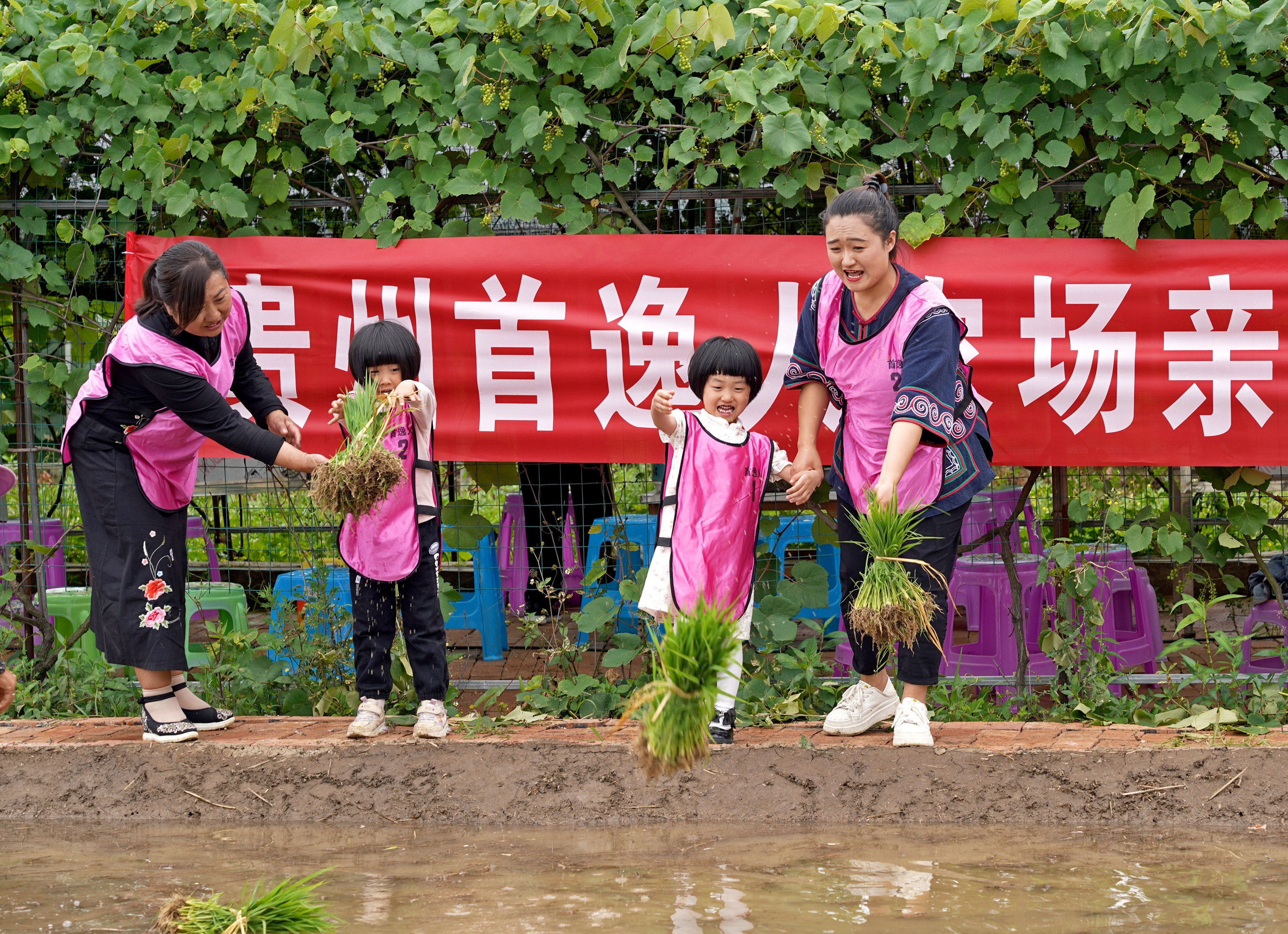 6月11日,在毕节市纳雍县寨乐镇首逸人农场,数十名家长孩子一起下田插秧,体验农耕文化。