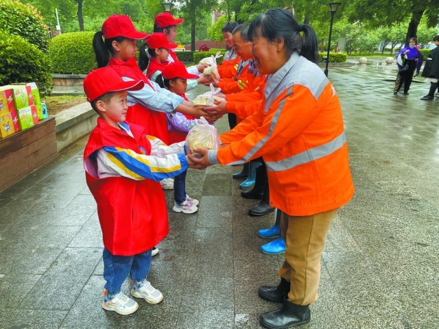 “叔叔阿姨辛苦啦!”说着,5名小志愿者将煎饼、豆腐脑组成的爱心早餐郑重地递到了环卫工人手中。