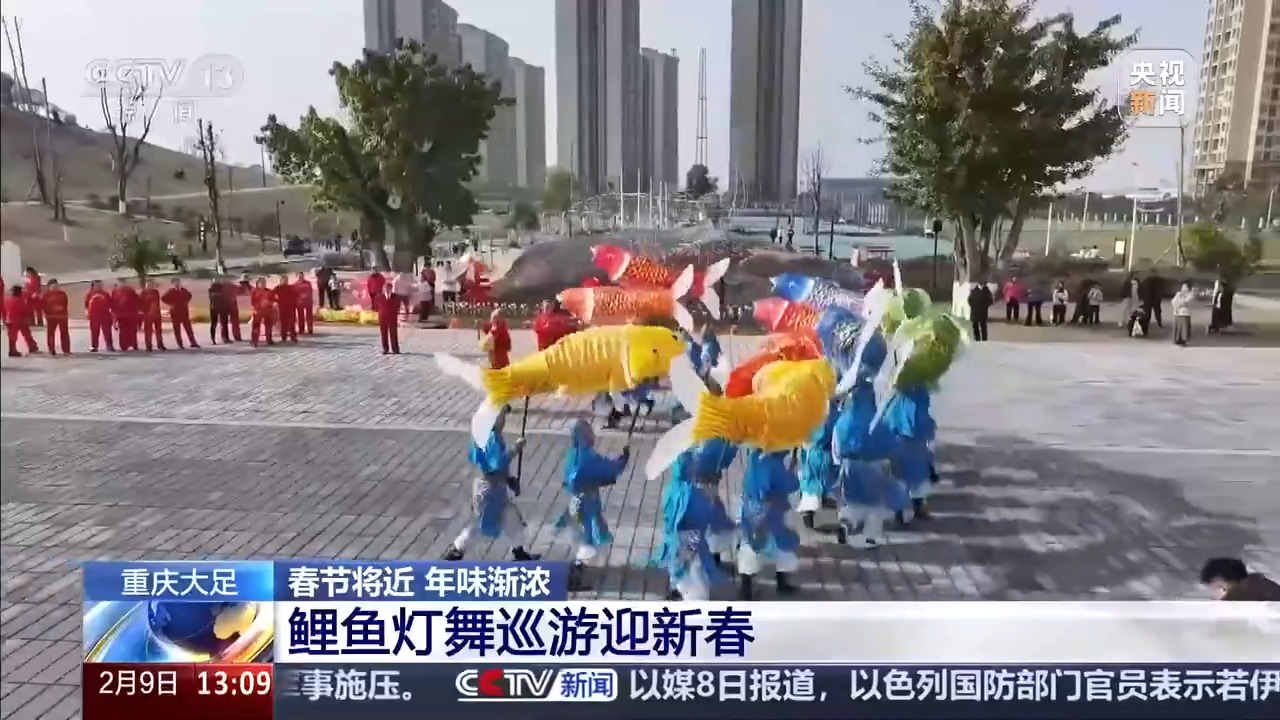 这两天,重庆市大足区的年节氛围热闹起来,鲤鱼灯舞开启迎新春巡游。巡游队伍穿行在集镇街巷,吸引了不少市民、游客观看、互动。