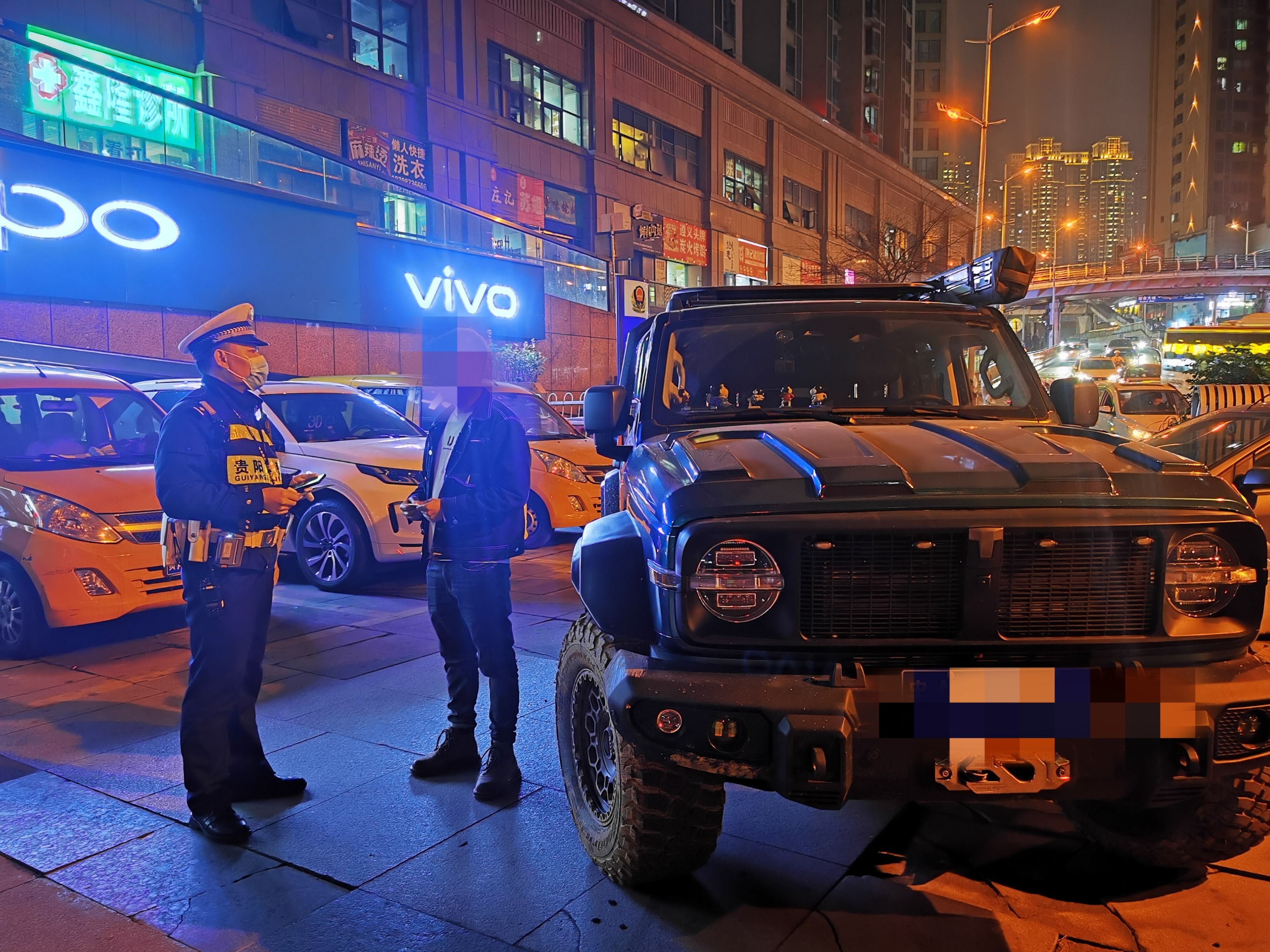 现场民警注意到该车的车轮和悬挂系统明显有改装痕迹,且底盘高度超过车辆技术参数要求,现场民警对曹某进行交通安全教育宣传,告知其非法改装存在的道路交通安全隐患。随后民警对曹某开具了道路交通安全违法行为处理告知书,并告知其在规定时限内将车辆改回原样后到交管局南明区接受进一步的处理。