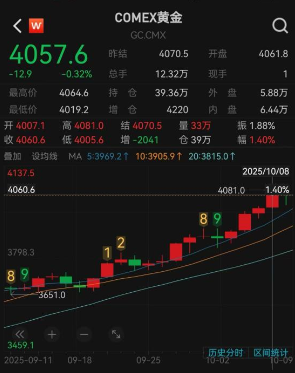 截至10月8日,COMEX黄金最高触及4081美元/盎司,创下历史新高。
